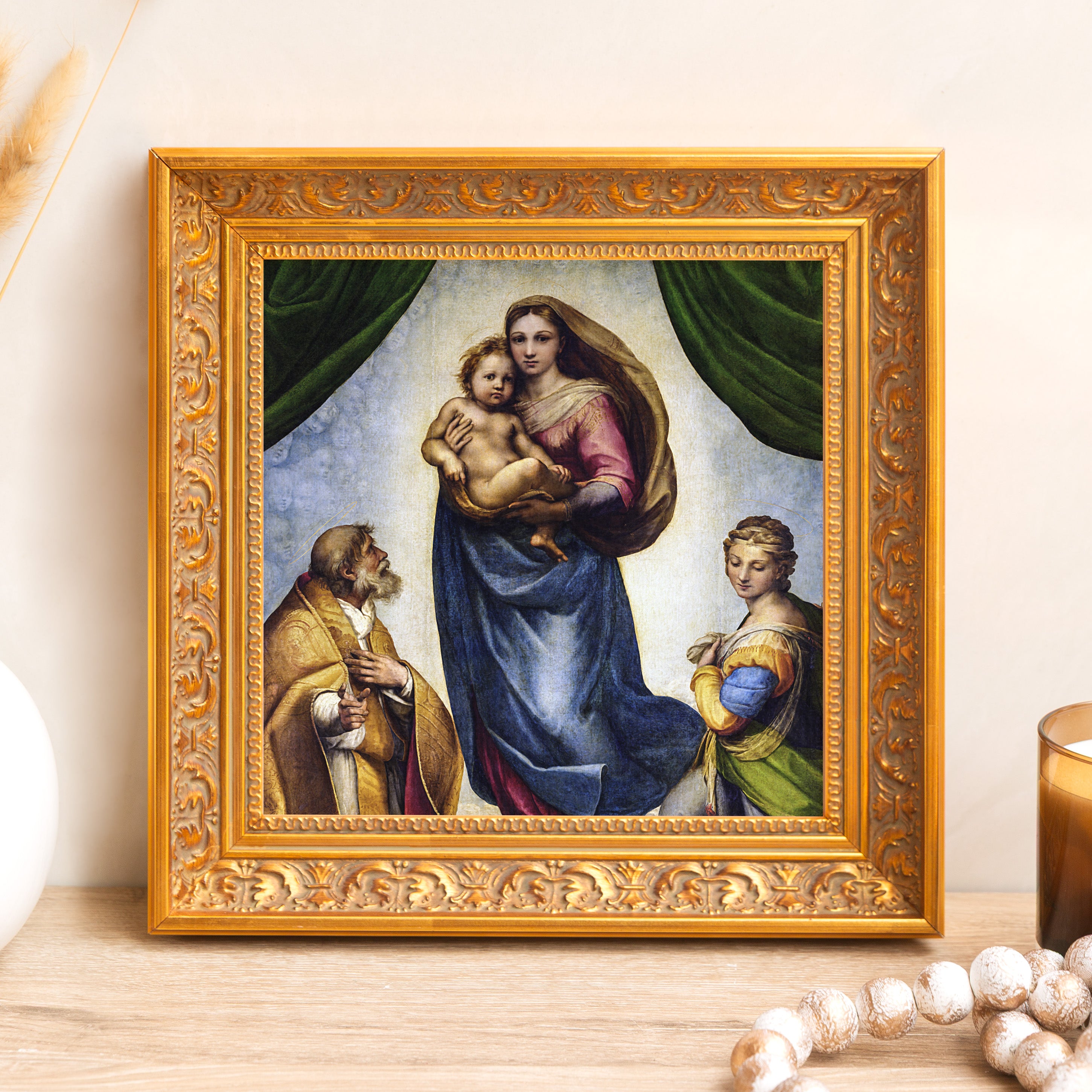 The Sistine Madonna Framed Canvas from The Catholic Company presents Raphael's renowned masterpiece in a beautifully crafted frame. Part of the exclusive Sacred Minis Collection, it features intricate framing and premium canvas printing, capturing the true essence of Catholic faith. Perfect for prayer corners or as a heartfelt devotional gift, this stunning piece is designed and handcrafted in their Charlotte, NC workshop.