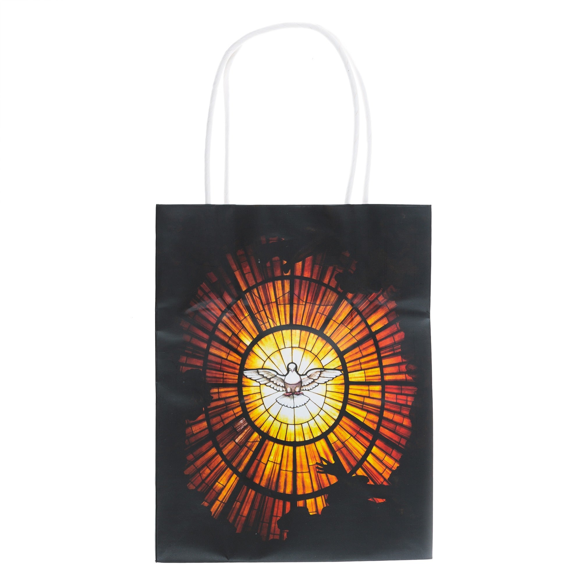 The Small Stained Glass Holy Spirit Gift Bag features a vibrant stained glass window design with a central dove, symbolizing the Holy Spirit. Ideal for Confirmation or other sacramental occasions, this colorful gift bag adds a festive touch to your gift. Dimensions: 5.25" (W) x 3" (D) x 6.75" (L).