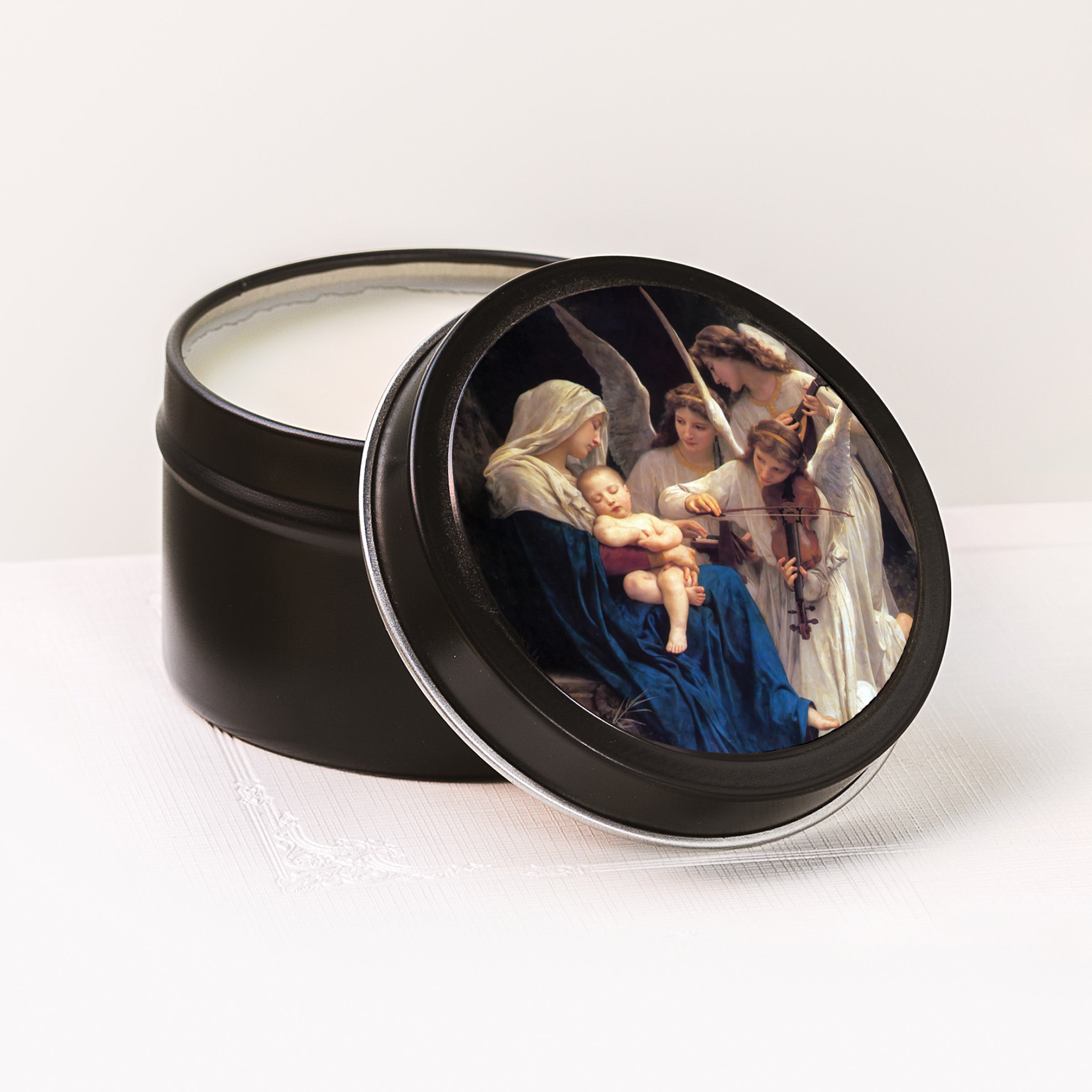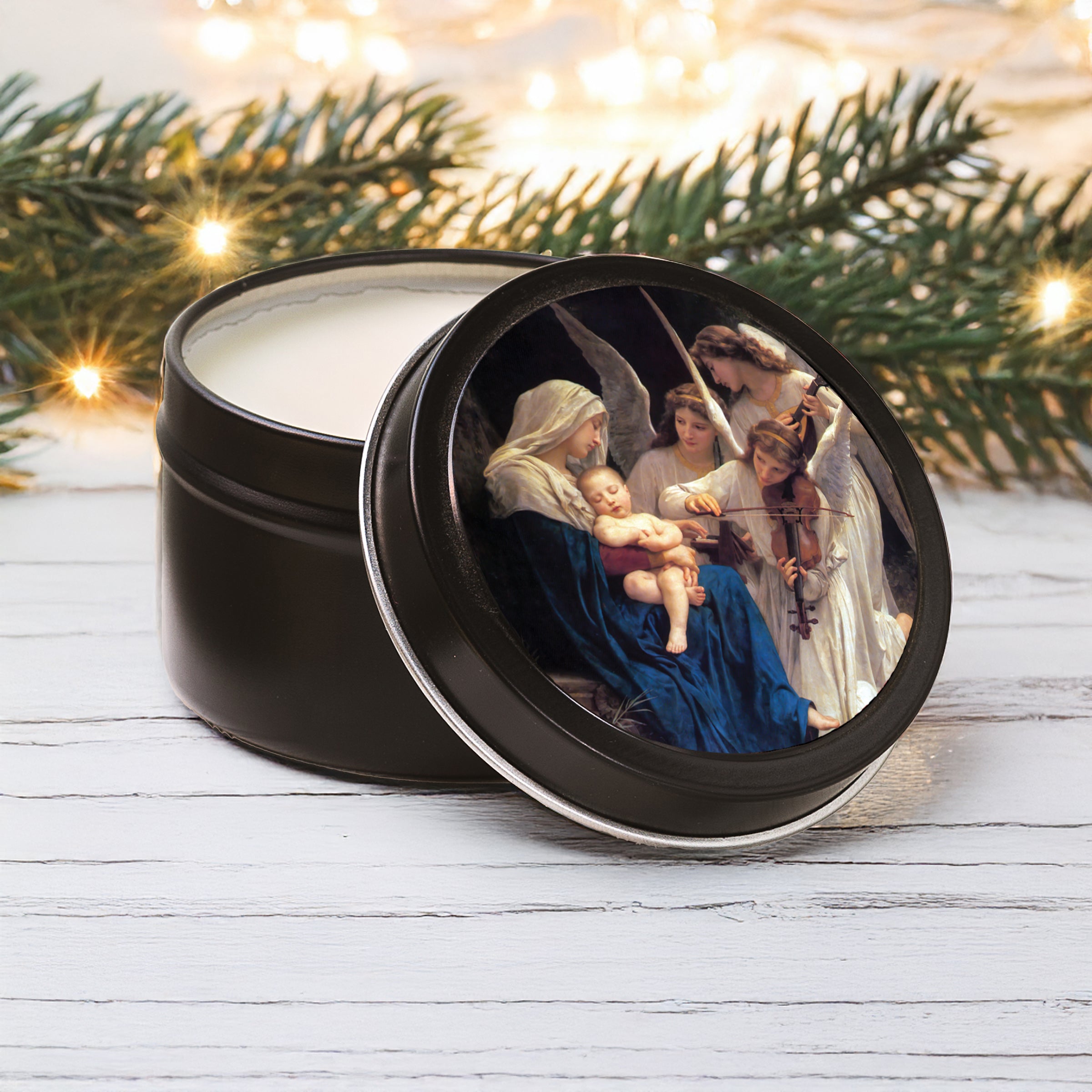 The Song of Angels Candle Tin offers a rejuvenating Christmas Tree scent with invigorating notes of balsam and pine, perfect for prayer or relaxation. Encased in a matte black tin adorned with William Bouguereau's artwork, this 6 oz. candle is both a portable delight and a thoughtful gift. Ideal for creating a peaceful atmosphere during the winter season or at Christmas.