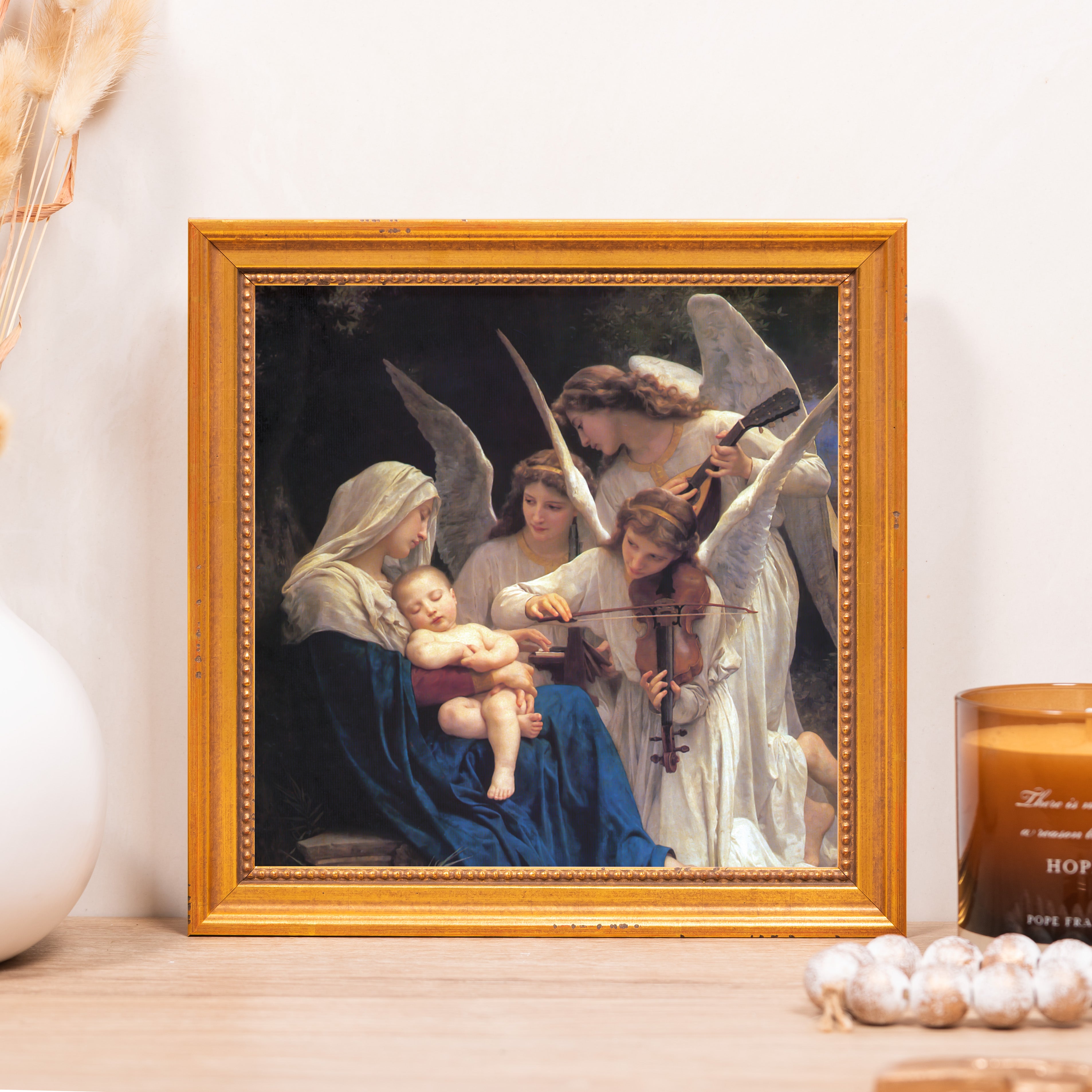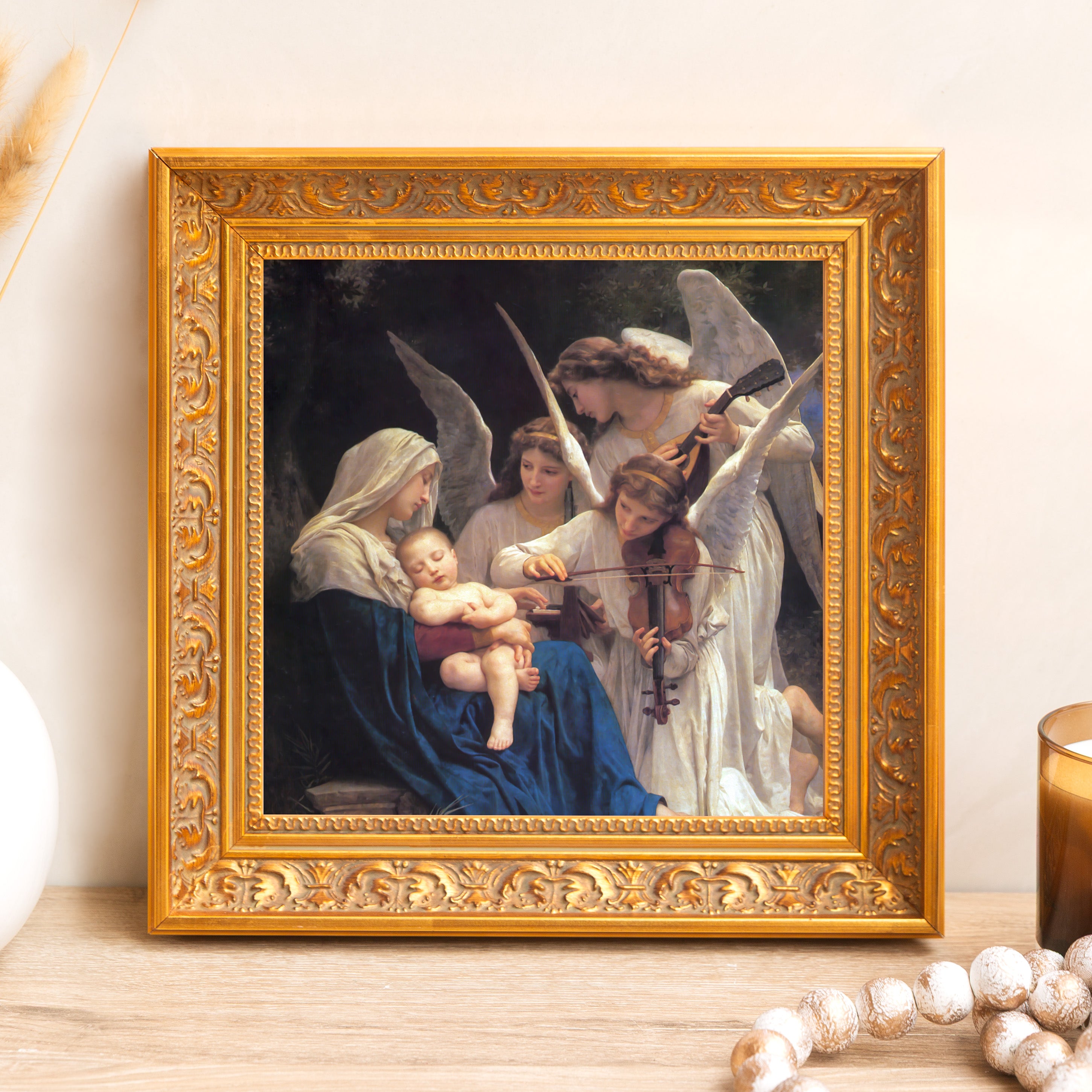 The Song of Angels Framed Canvas by Bouguereau is part of The Catholic Company's exclusive Sacred Minis Collection. This exquisite piece is handcrafted with a choice of ornate gold wood frames, showcasing the tranquility of Our Lady and the Christ Child serenaded by angels. Perfect for prayer corners or as a meaningful gift, this unique artwork adds elegance and devotion to any space.