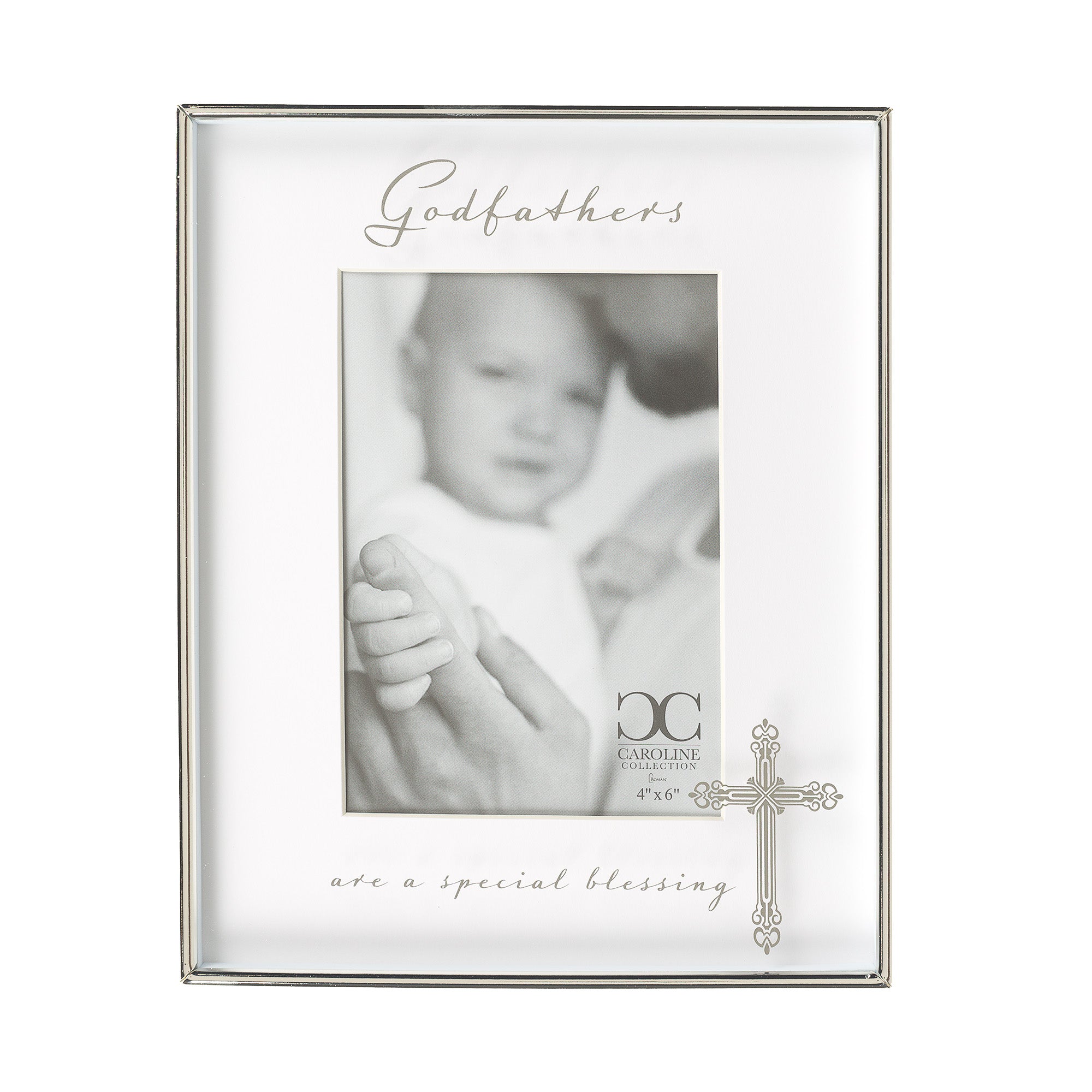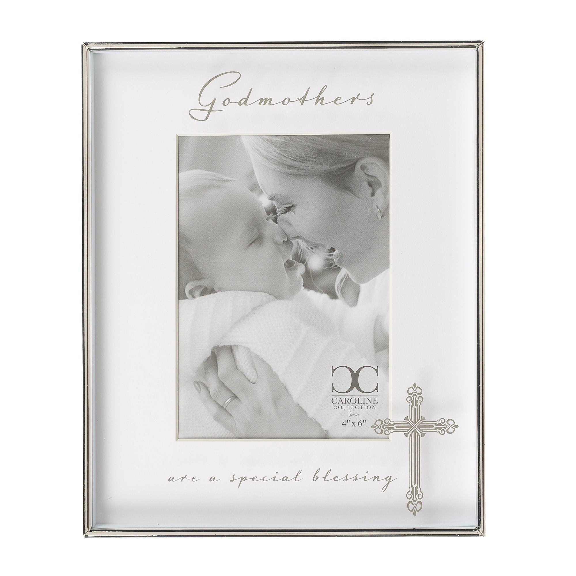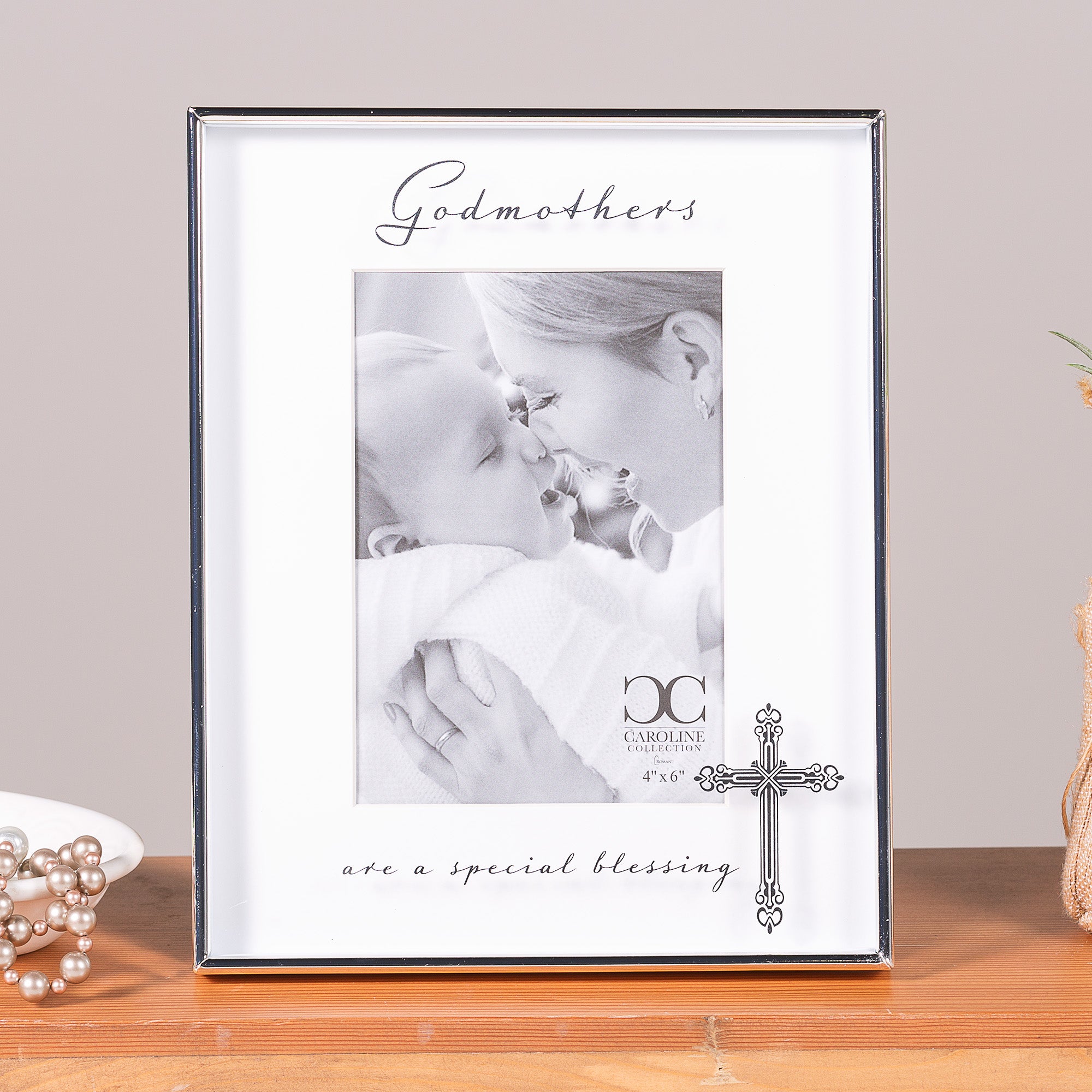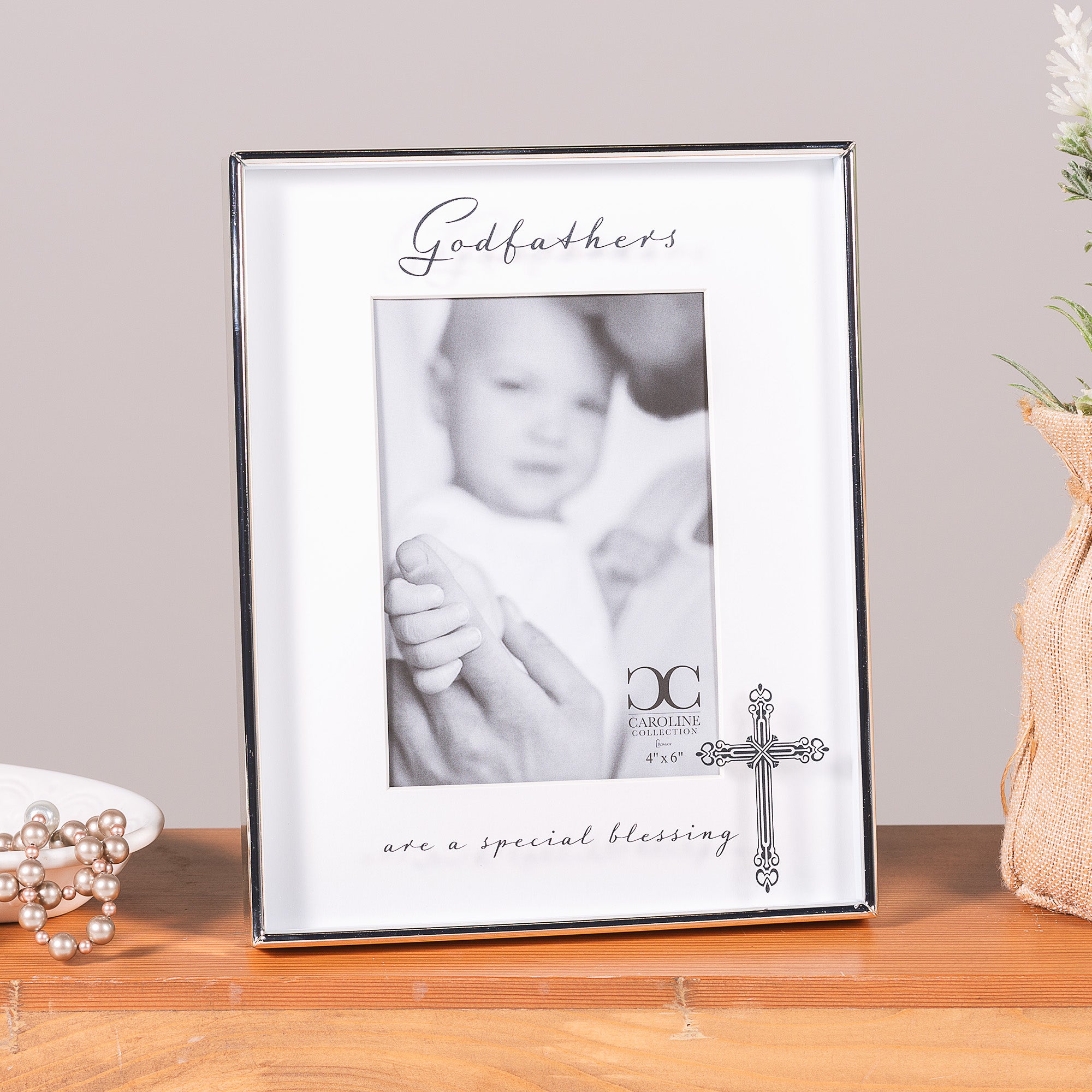 In the lower corner of the frame, a gray filigree Cross is etched as an elegant and meaningful accent. Choose Godmother or Godfather Frame. The perfect way to thank Baby's Godparents and share memories of Baptism day.