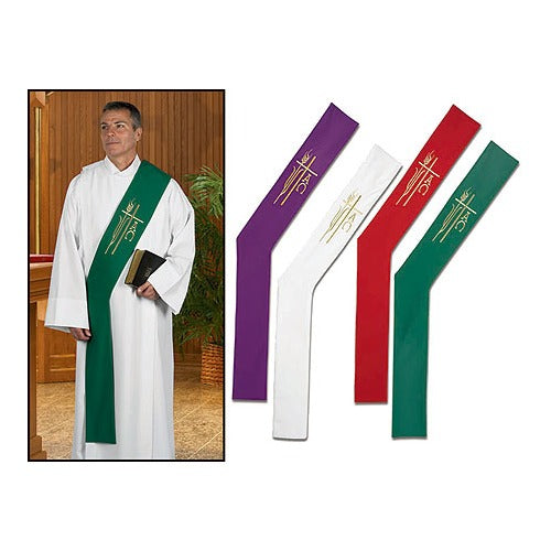 This fully lined Deacon Stole has reinforced stitching and seams and features an embroidered Alpha, Omega, Cross, and wheat sheath design. A side cord keeps the stole comfortably in place. Available in red,white, green or violet, it can be worn throughout the seasons of Lent, Pentecost, Advent, Christmas, and Ordinary Time.