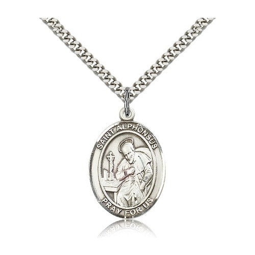 Sterling Silver St. Alphonsus Pendant on a 24'' Light Rhodium Heavy Curb Chain with clasp. Size: 1 x 3/4 inches.