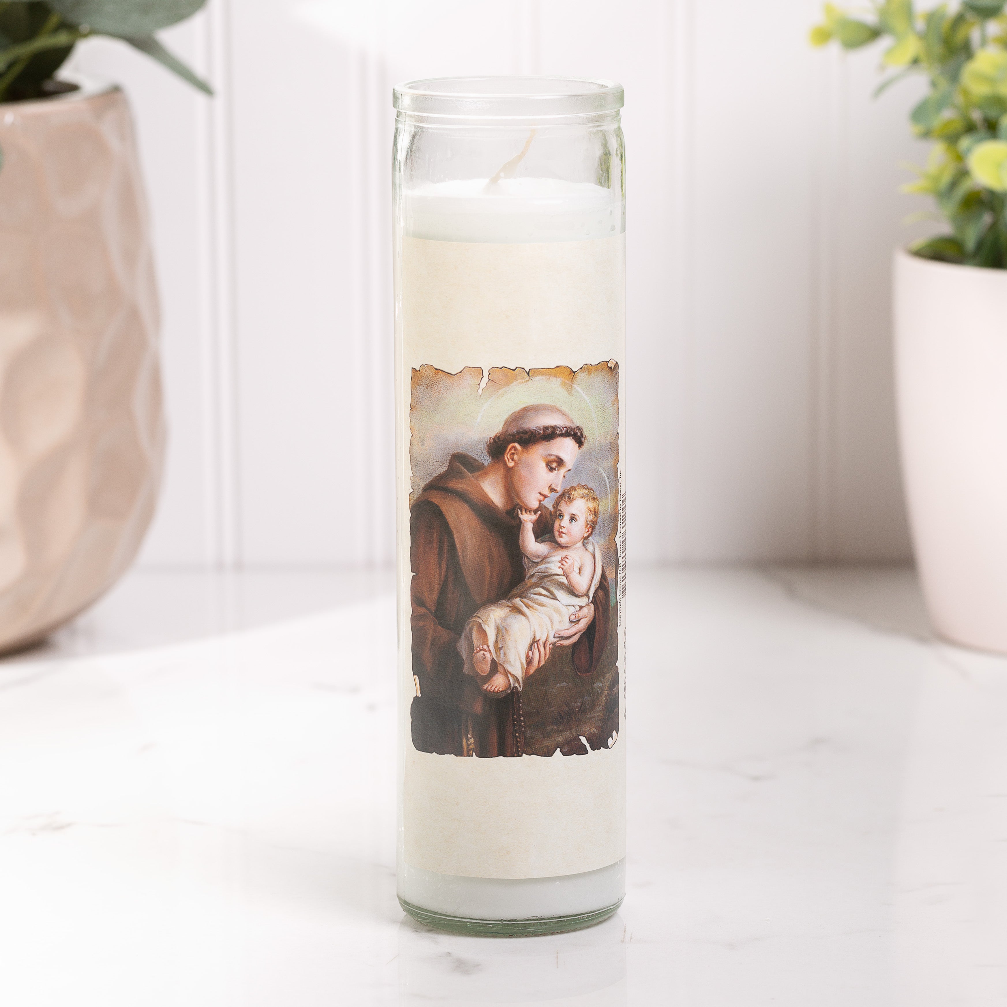 Candles are an important part of Catholic tradition, used both in liturgy and in the home.  Devotional candles are a popular favorite for many Catholics for personal use.  Devotional candles typically feature a religious image or heavenly scene on the front with a special prayer on the back.  After the candle is lit the prayer on the back of the candle is recited from a devoted heart. The candle flame becomes a symbol of the prayer of the faithful offered up to God, and the image becomes a visual reminder of heaven. This Catholic candle features St Anthony holding the Christ child.  The popular image is a reminder to seek St. Anthony's intercession.  As the patron saint of lost things, you can ask for his help when trying to find a lost item!  Also features a bilingual prayer to St Anthony.  This Catholic candle is great for devotional use, and the perfect addition to your home prayer corner!