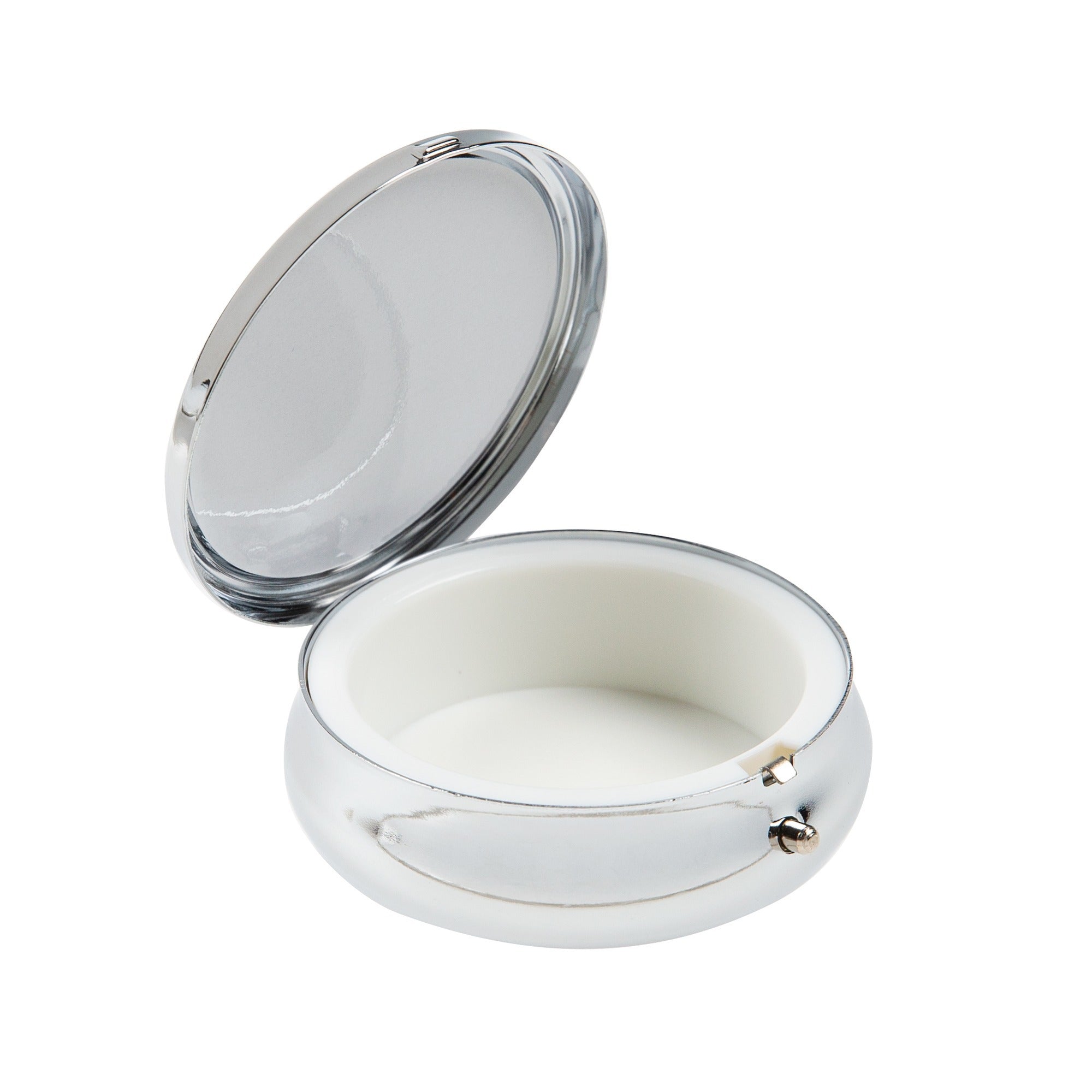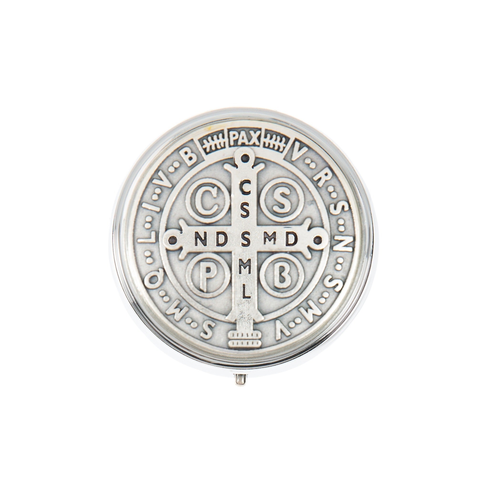 This sleek rosary container has a metal exterior with a clean, cream colored interior. The clear image of the St. Benedict medal on the cover provides a sense of St. Benedict's spiritual protection, and reminds us that the rosary too is a spiritual weapon! Perfect gift to pair with a rosary. Crafted in Italy.