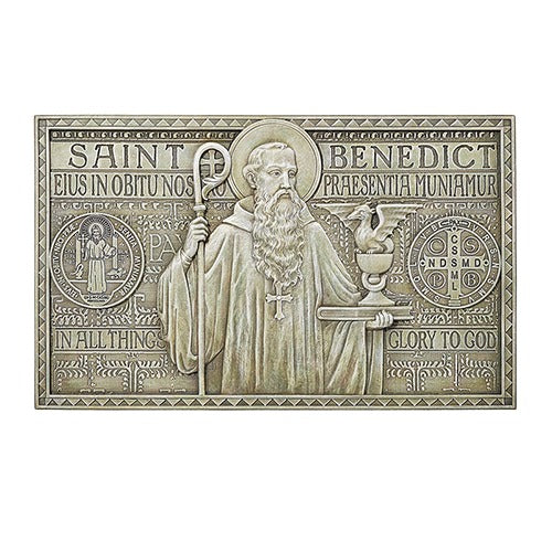 The Saint Benedict medal has long enjoyed a reputation as a source of spiritual protection. This decorative plaque features a lifelike depiction of the great saint holding a crozier, book, and chalice containing a small dragon. To Benedict's right and left is the traditional rendering of the Benedictine medal. Place in a prayer garden, or display above the entrance in your home to reap the blessings of this treasured symbol.
