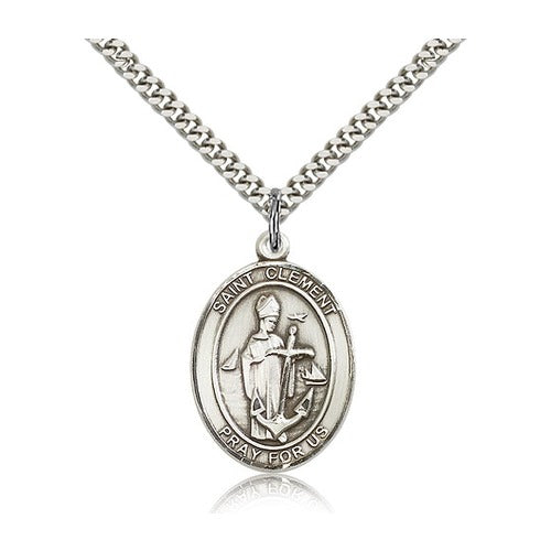 Sterling Silver St. Clement Pendant on a 24'' Light Rhodium Heavy Curb Chain with clasp. Size: 1 x 3/4 inches.