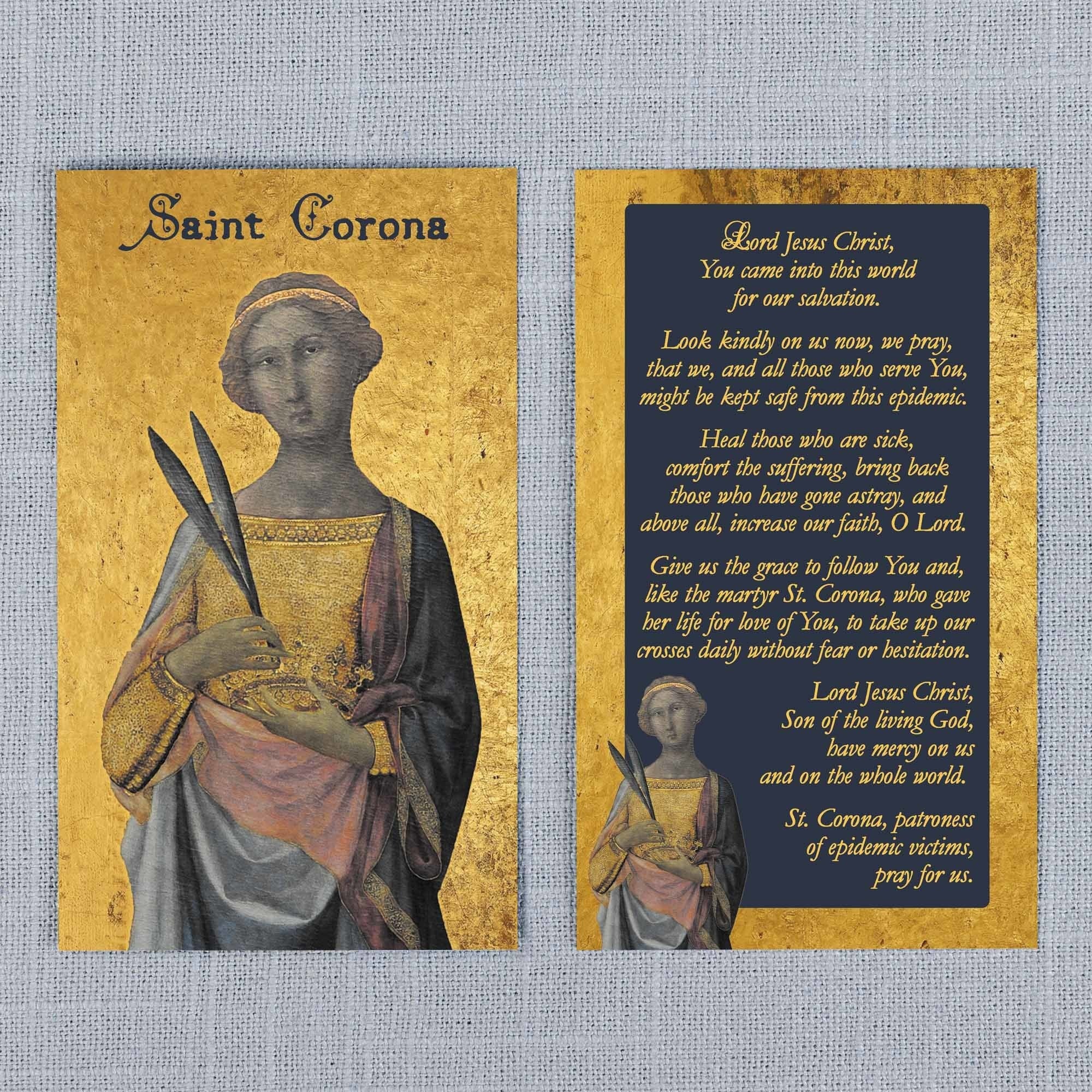 The prayer on the card reads: "Lord Jesus Christ, You came into this world for our salvation. Look kindly upon us now, we pray, that we, and all those who serve you, might be kept safe from this epidemic. Heal those who are sick, comfort the suffering, bring back those who have gone astray, and above all, increase our faith, O Lord. Give us the grace to follow You and, like the martyr St. Corona, who gave her life for love of You, to take up our crosses daily without fear of hesitation. Lord Jesus Christ, Son of the living God, have mercy on us and on the whole world. St. Corona, patroness of epidemic victims, pray for us.
