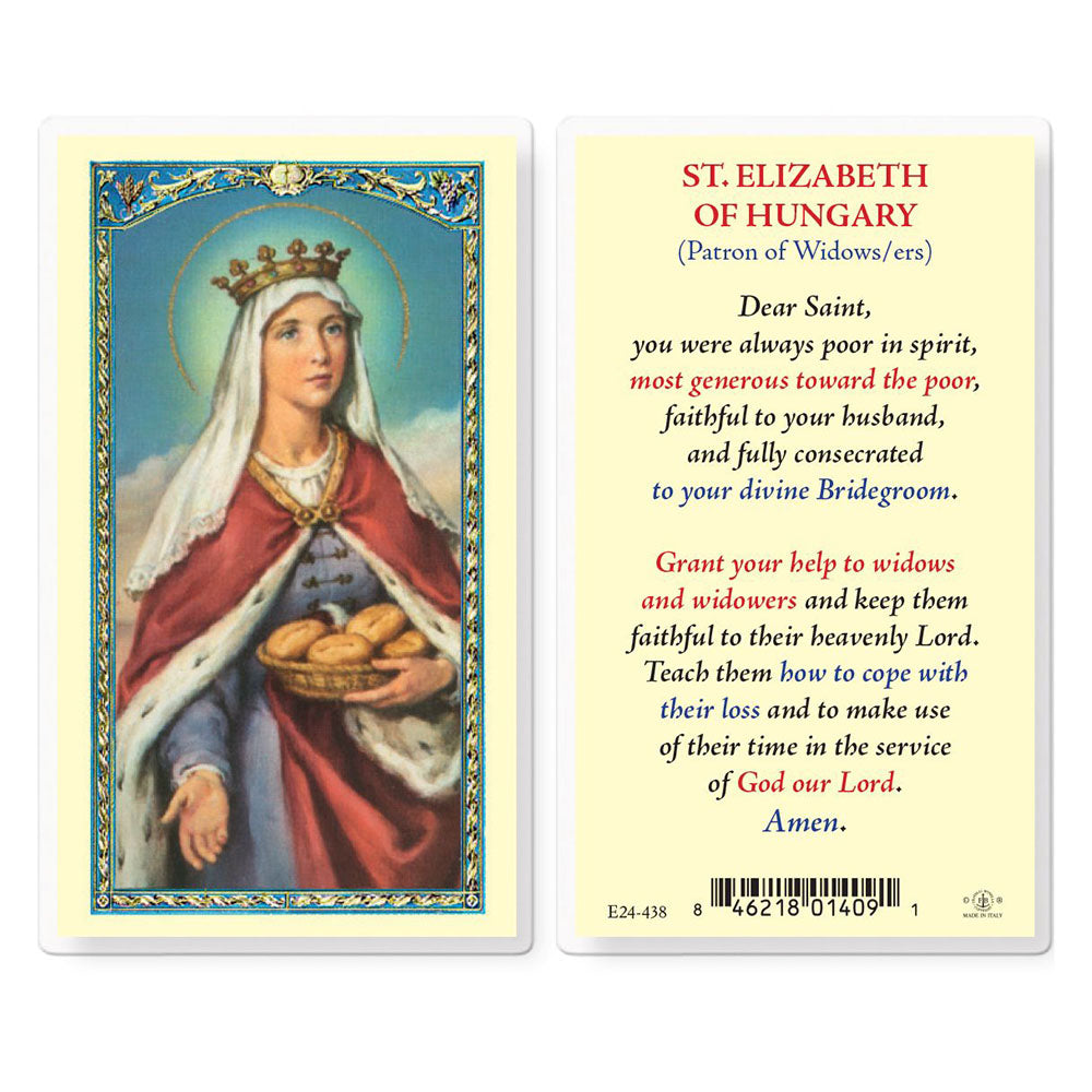 A lovely laminated prayer card, in full color, with traditional imagery, featuring St. Elizabeth of Hungary on the front. A beautiful prayer invoking her intercession for widows and widowers is elegantly printed on the reverse. Thoughtful small gift & faith, comfort and inspiration. Made in Italy.