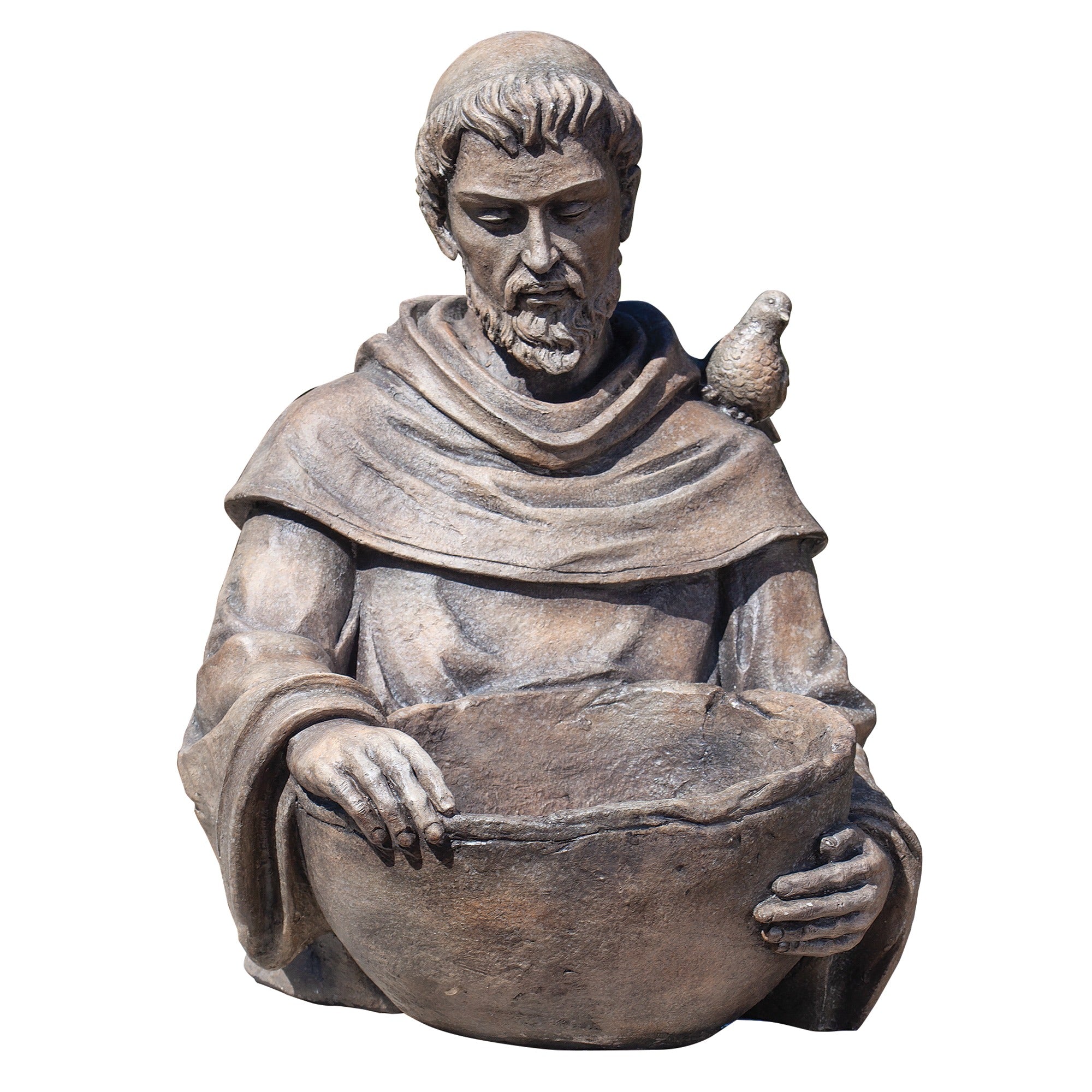 The saint himself would be charmed by this simple bird bath. Place it in a garden to attract God's lovely winged creatures. Be sure to keep fresh water in the bowl and they will serenade you often. St. Francis holds the bowl himself, as a friendly bird perches upon his shoulder, Serene tones of brown and grey add to the simplicity and elegance.
