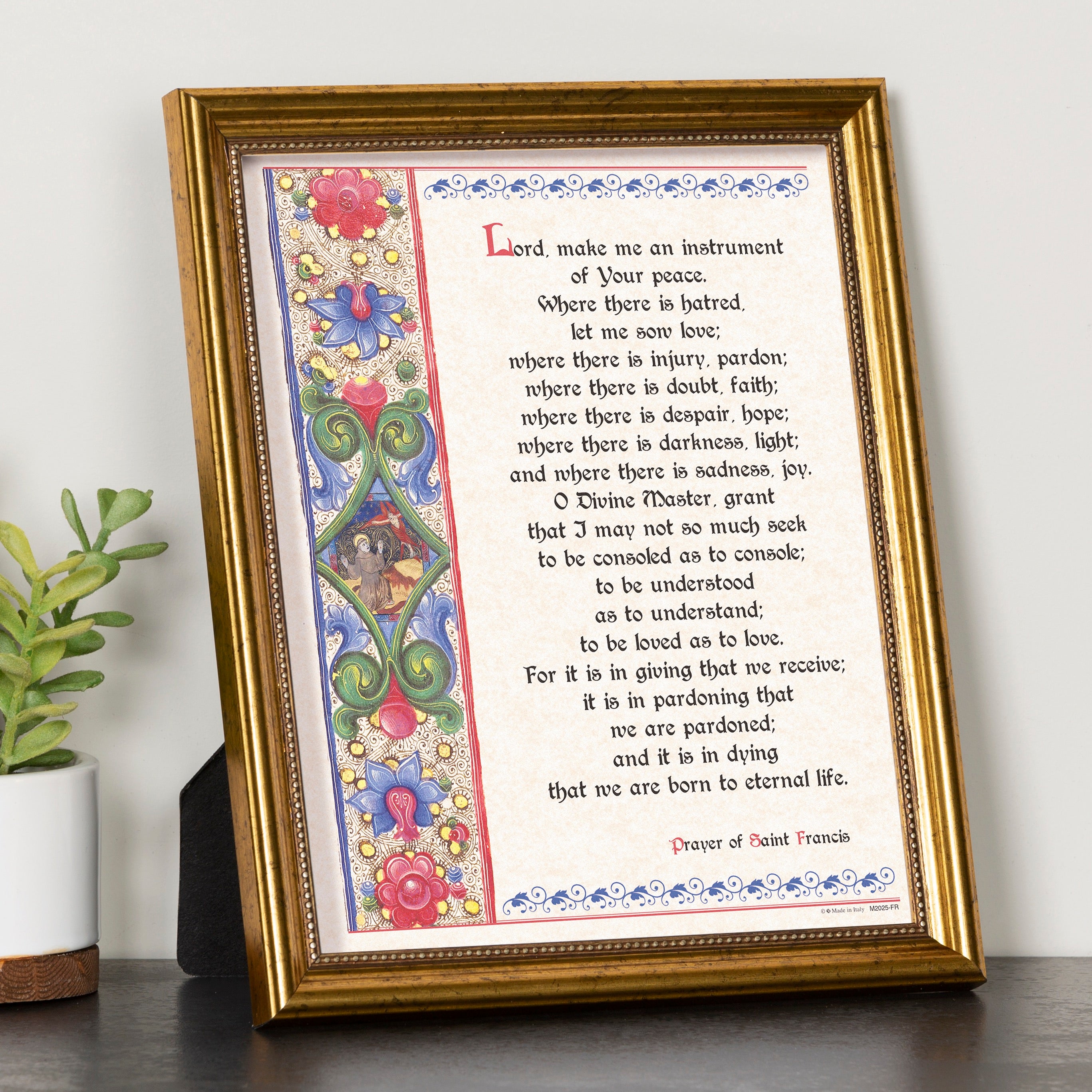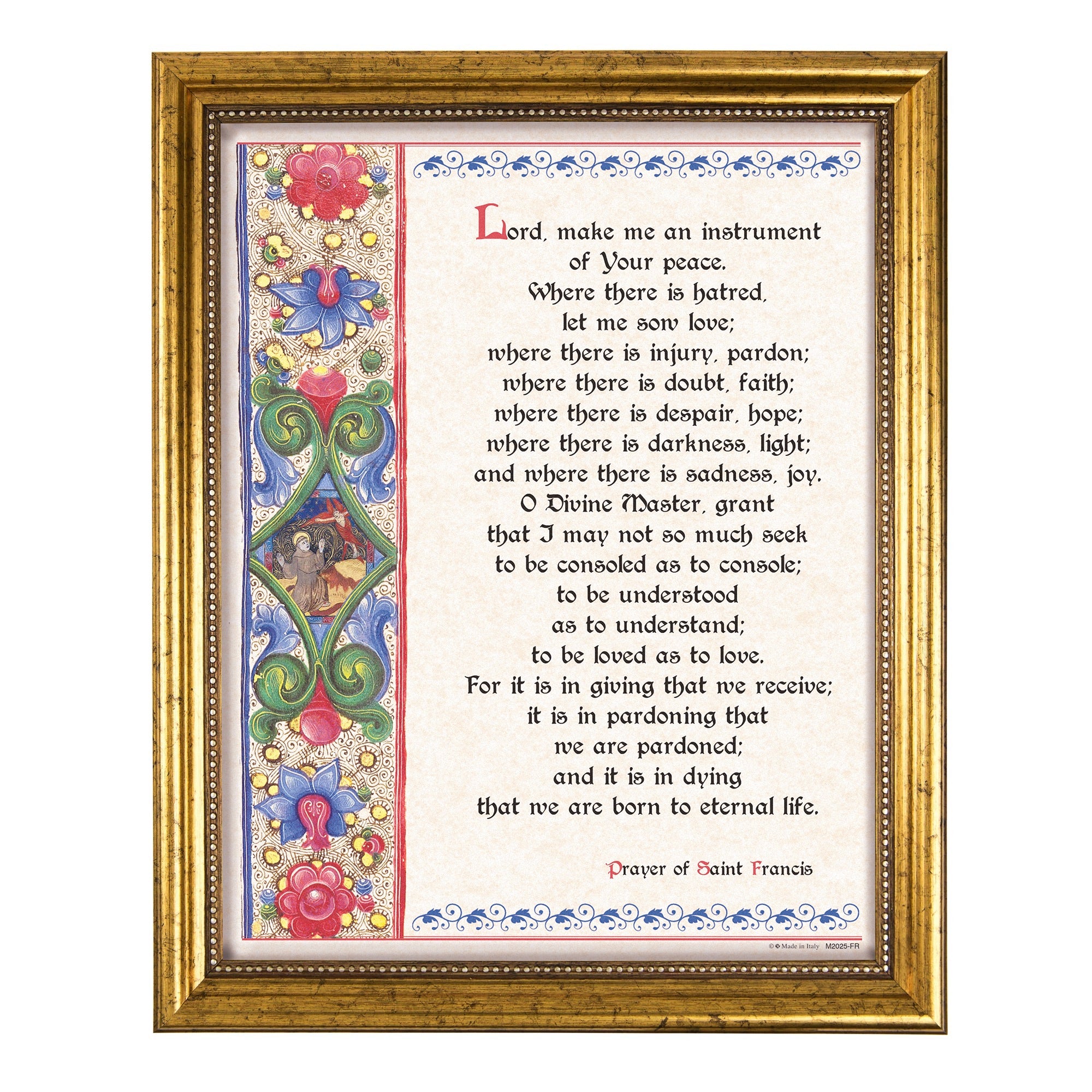 Enhance your home with the St. Francis Parchment Print, an 8x10 framed decor piece featuring the beloved Prayer of St. Francis. Featuring elegant font and illustrations, it comes in an ornate gold frame, adding spiritual and aesthetic beauty to any space. Exclusively designed by The Catholic Company, it offers a profound reflection on peace and humility.