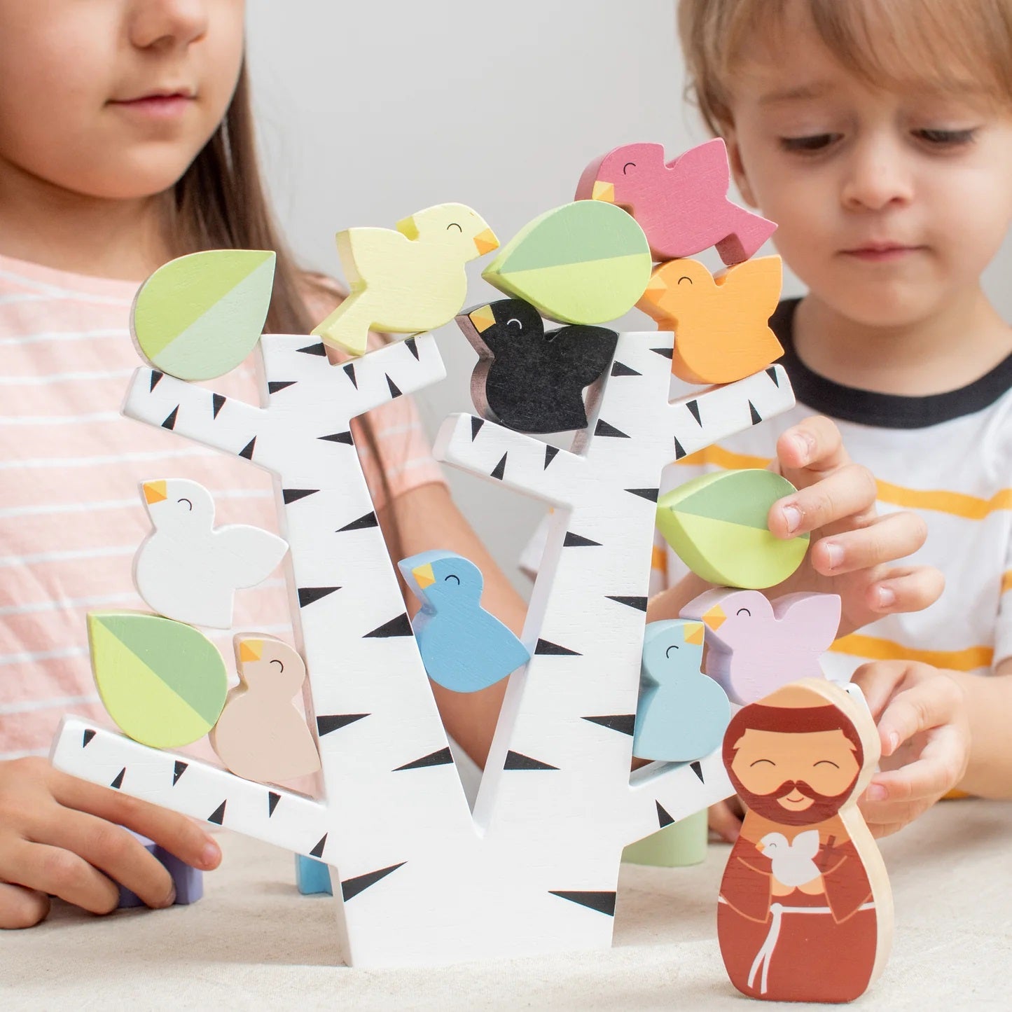 The St. Francis Preaches to the Birds Wooden Stacking Toy is a delightful and colorful game for children and families, featuring chunky wooden birds and leaves to stack on a tree. This engaging toy enhances hand-eye coordination, patience, and perseverance, while illustrating the beauty of creation. Perfect as a family game or quiet activity, it's an ideal gift for Catholic kids and families.