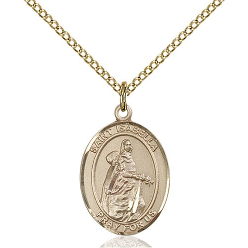 14kt Gold Filled St. Isabella of Portugal Pendant on an 18" 14kt Gold Filled Lite Curb Chain. 14 Karat Gold Filled. The look and feel of solid 14 Karat Gold at a fraction of the price. Size: 3/4 x 1/2. Patronage: Peace/Charities.