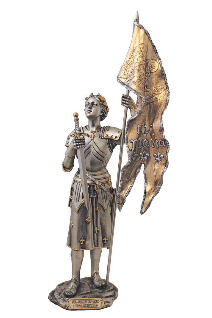 The St. Joan of Arc Pewter Style Statue stands 11 inches tall, showcasing elegant lines and detailed craftsmanship in cold cast bronze with silver and gold accents. This inspiring figure captures the courage of the patron saint of France, soldiers, and prisoners, making it a remarkable gift for those devoted to her legacy, fit for any tabletop or prayer space. Perfect for inspiration and faith.