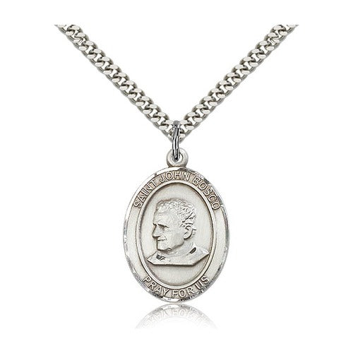 Sterling Silver St. John Bosco Pendant on a 24" Light Rhodium Heavy Curb Chain with clasp. Size: 1 x 3/4. Patronage: Students/Apprentices. Made in the USA.