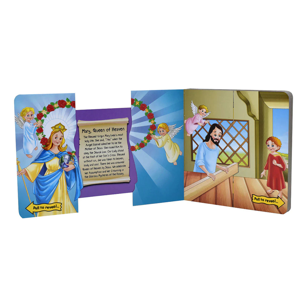 Within the pages of this cleverly designed, innovative board book, ten hidden Saint stories emerge. All children have to do is slide each page open to reveal story after story. A great book for kids.