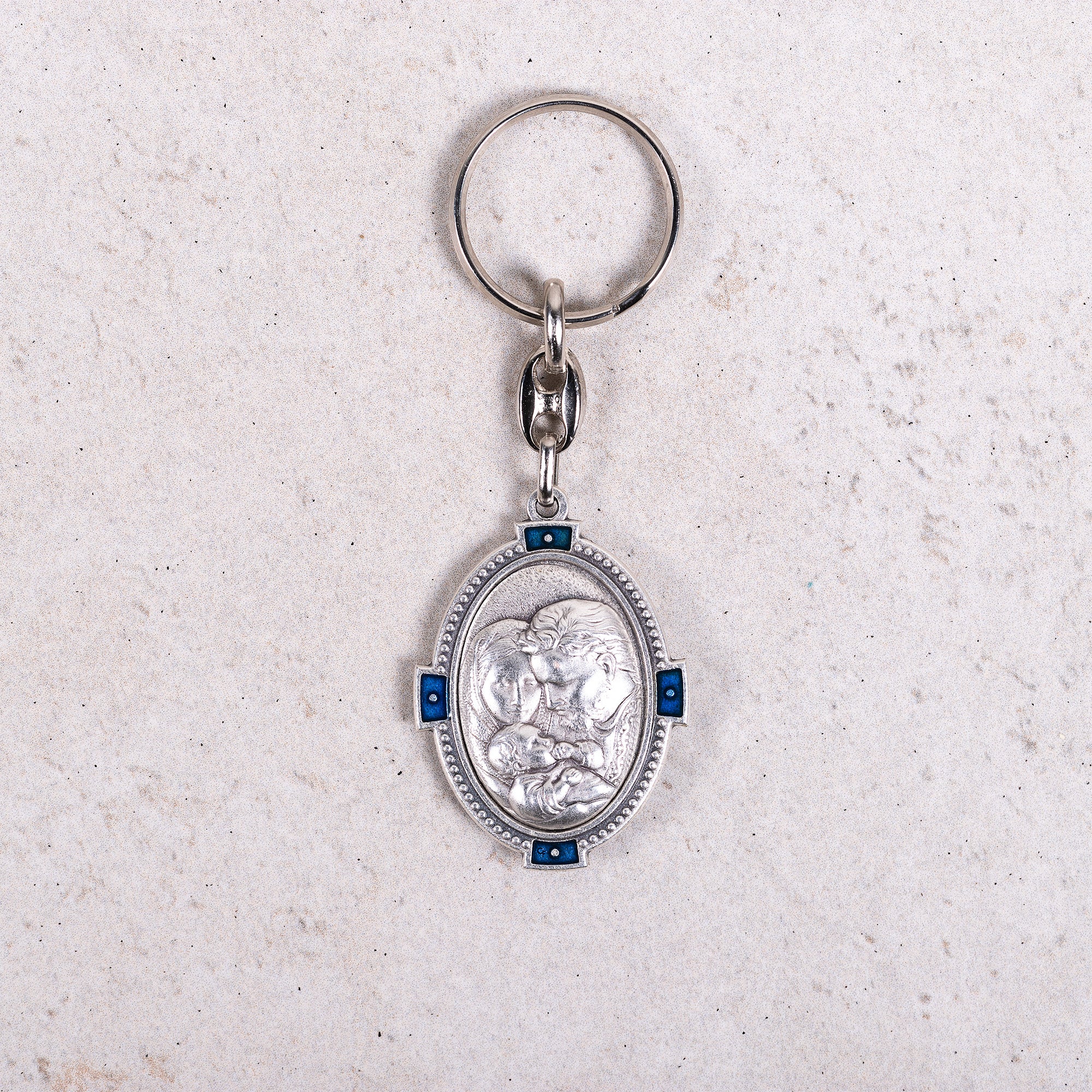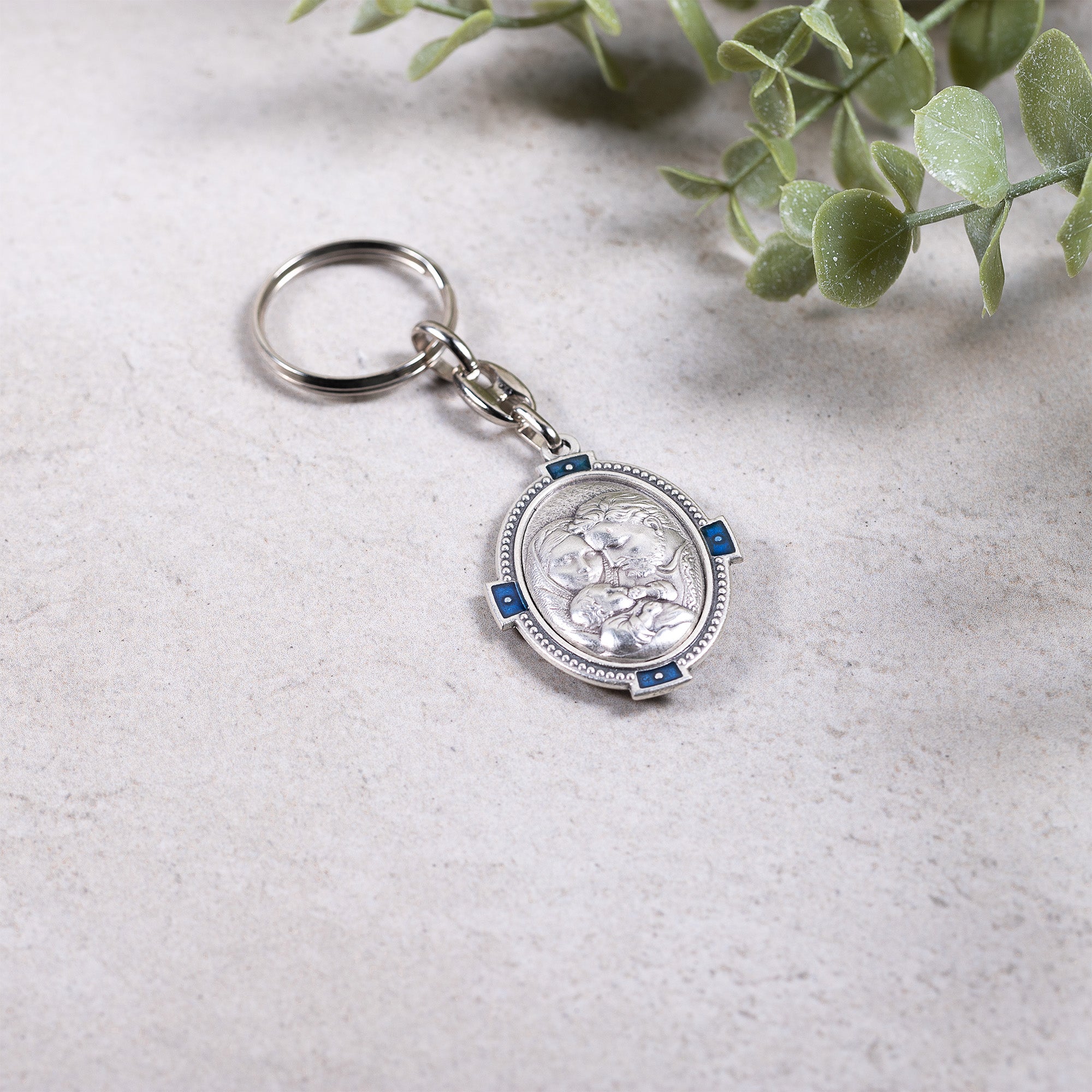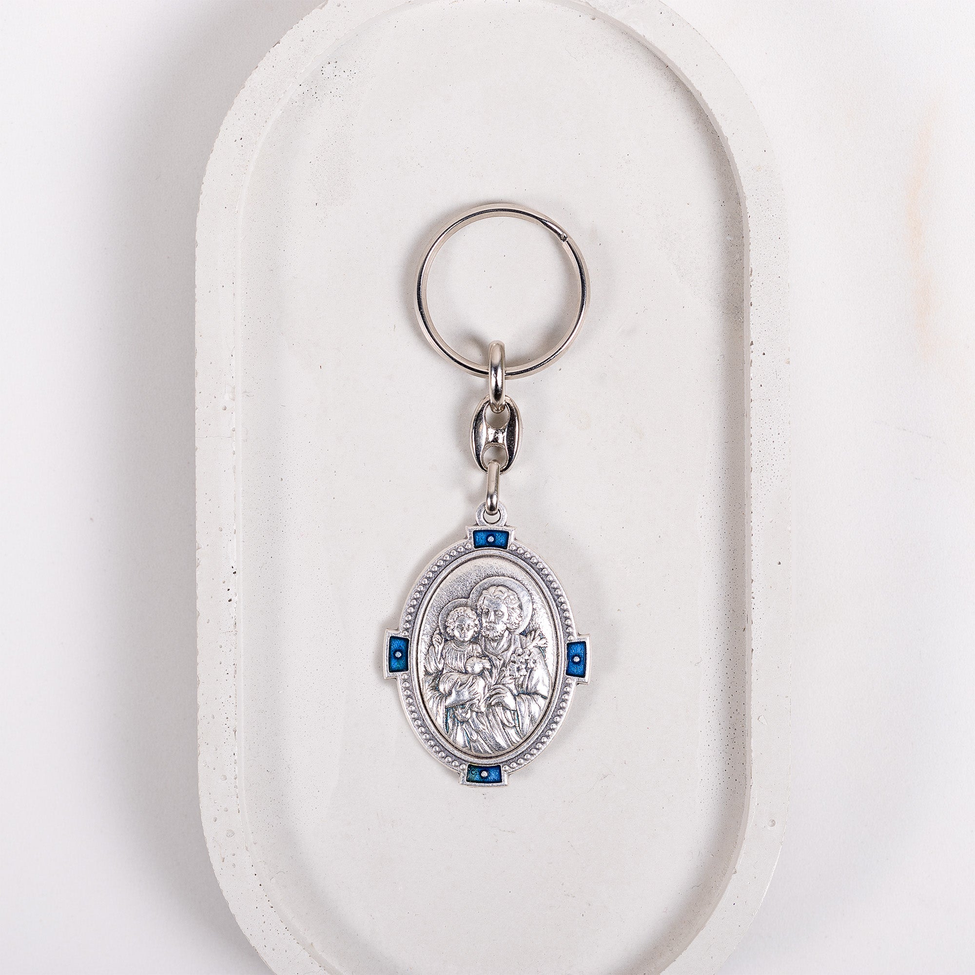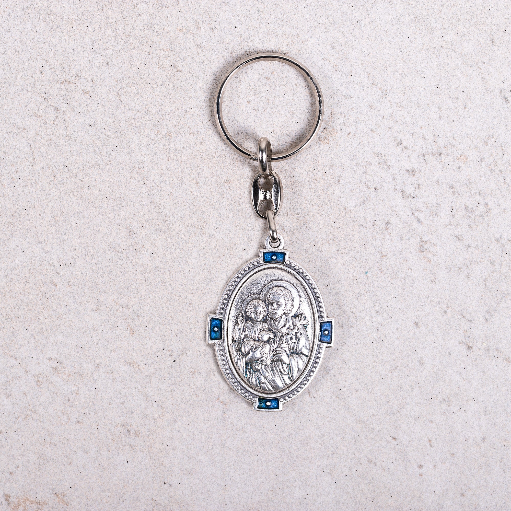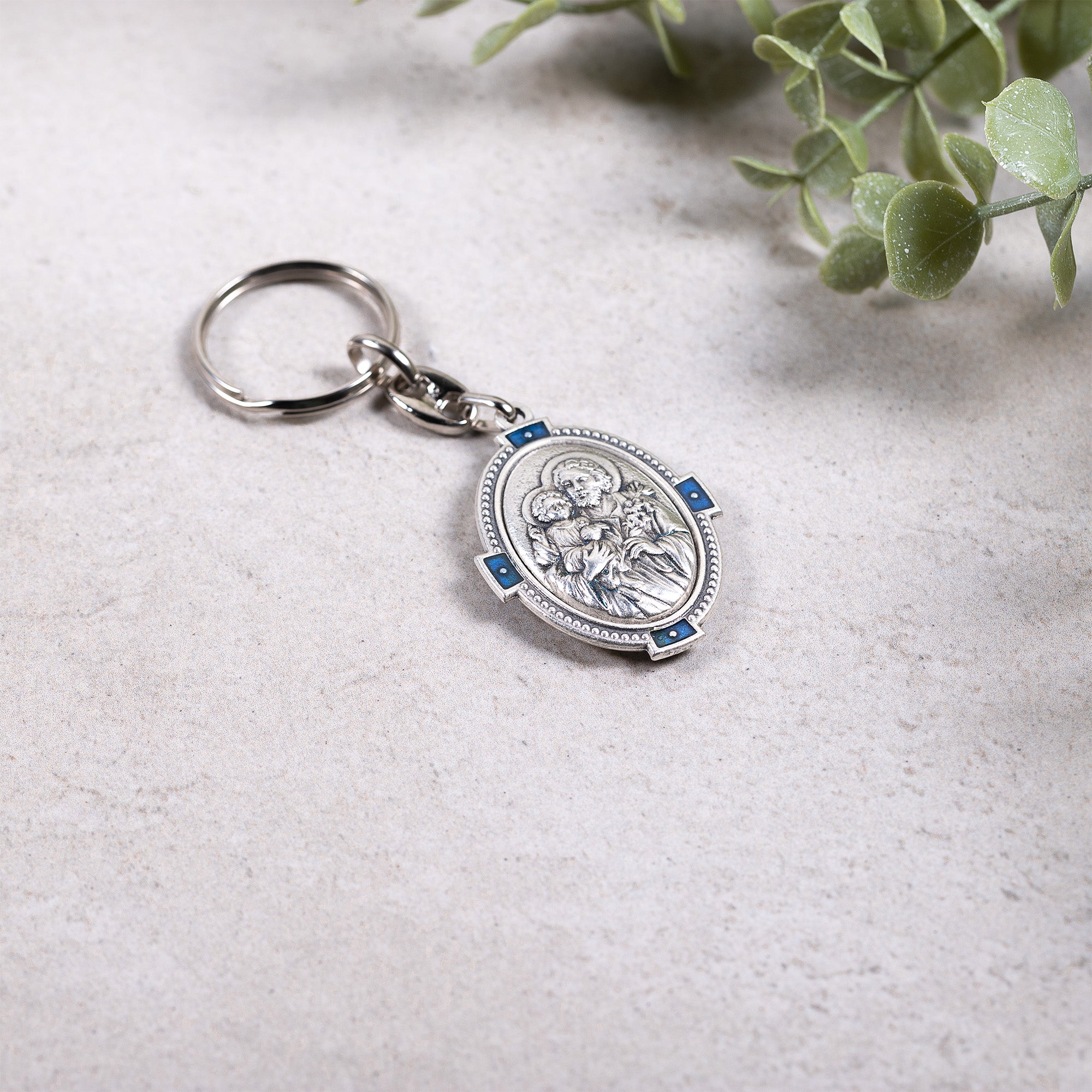 A key ring that will remind you of the fatherly patronage and protection of St. Joseph, featuring a beautifully crafted medal of St. Joseph and the Child Jesus at the center, surrounded by a bead texture border and blue enamel accents. Great gift for fathers, grandfathers and fathers-to-be and a special expression of faith for those devoted to St. Joseph.