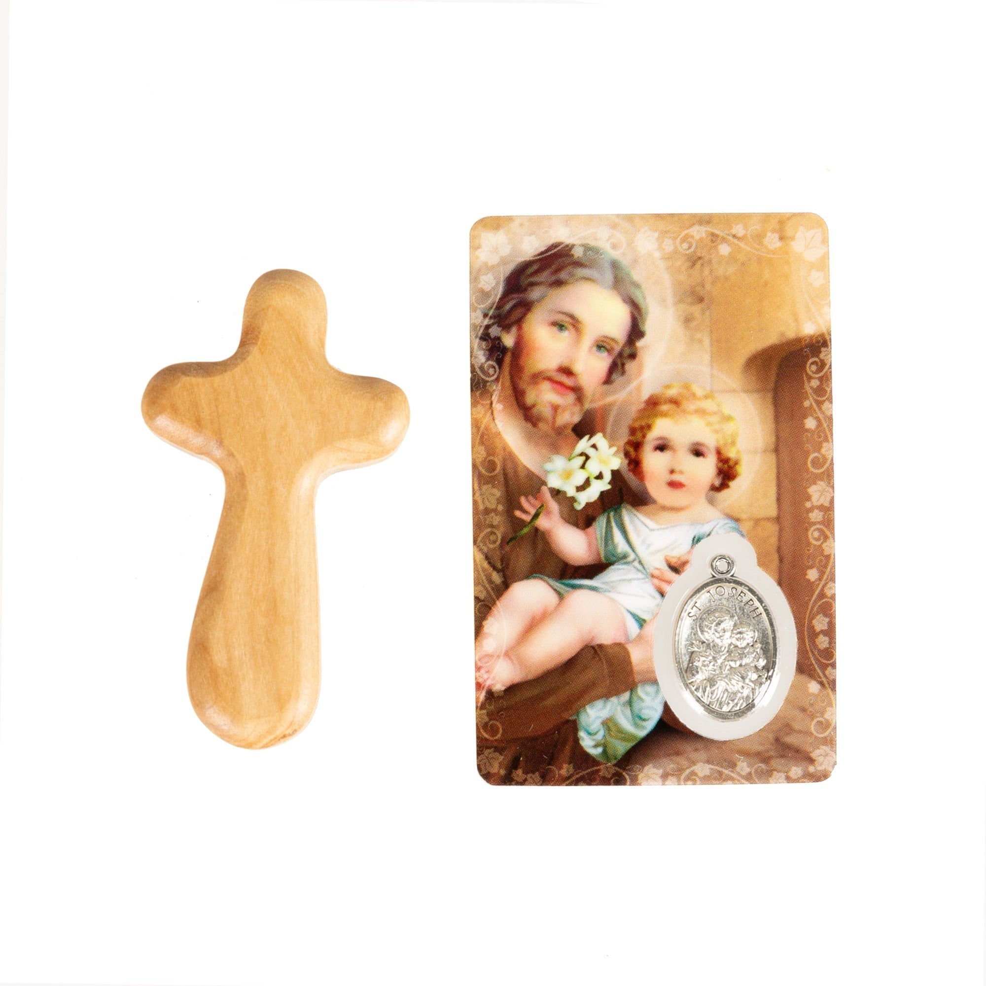 The St. Joseph Prayer Card & Olive Wood Comfort Cross Set is a meaningful gift offering solace and encouragement. It includes a full-color prayer card featuring St. Joseph and the Christ Child, with an encapsulated silver-tone medal. The smooth olive wood Comfort Cross, crafted in Bethlehem, perfectly fits in your hand, providing comfort during times of worry or suffering. Ideal for those seeking hope and support.