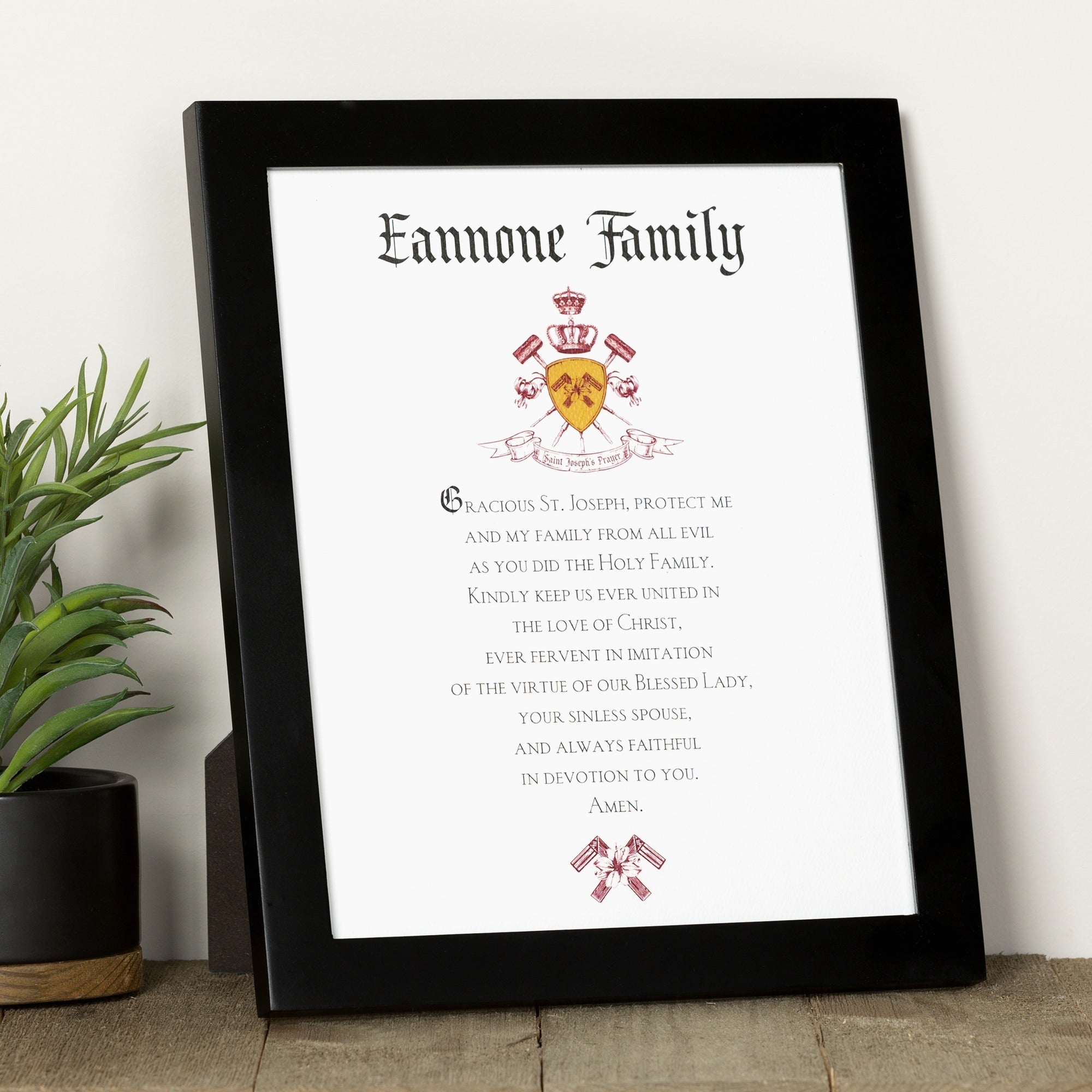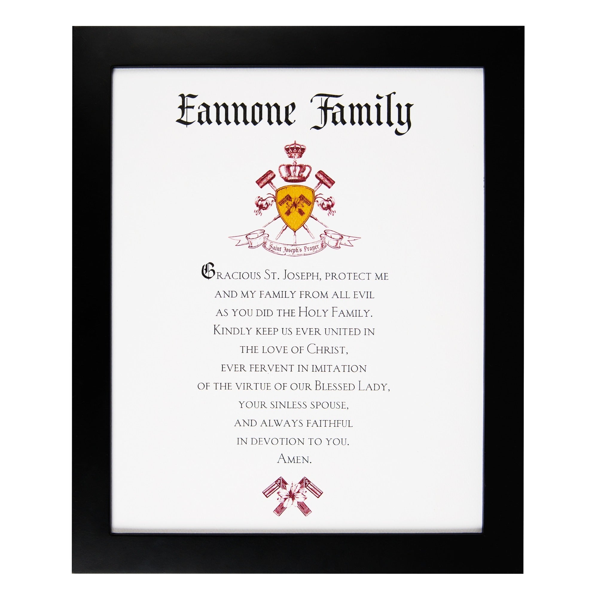 Call upon the humble foster father of Jesus to watch over you and your loved ones as he did the Holy Family with this exclusive gallery-style black framed Saint Joseph family prayer of protection. An attractive piece of Catholic artwork for your home that encourages prayer and devotion. The addition of the family name makes this a unique piece that any family will cherish.