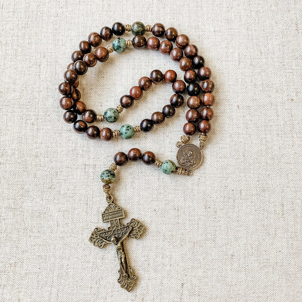The St. Joseph & Two Hearts Wood Bead Corded Rosary is a beautifully crafted blend of modern and timeless features. It combines rich dark wooden beads and green Jasper gemstones, with a vintage centerpiece medal honoring St. Joseph. A gold Italian Pardon Crucifix completes the design, offering simple elegance and enduring style—perfect as a meaningful, durable gift for him, made in the USA.