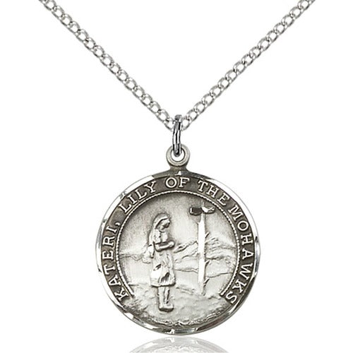 The St. Kateri Pendant is crafted in sterling silver and measures 3/4 x 5/8 inches. It includes an 18" sterling silver lite curb chain with a clasp. Hand-made in the U.S.A., it honors St. Kateri's patronage of the environment and is guaranteed to not tarnish, offering both beauty and durability. Perfect for nature lovers and those devoted to St. Kateri.