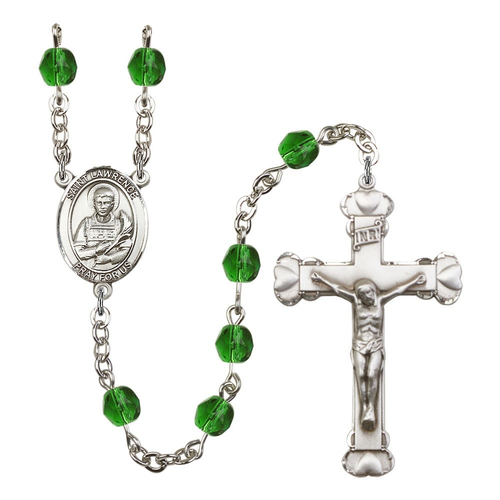 Silver Finish Rosary features 6mm green Czech Fire Polished glass beads. The centerpiece features a St. Lawrence medal. Emerald is the birthstone color for May.