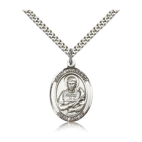 This elegant St. Lawrence pendant is crafted from sterling silver and hangs on a 24" light rhodium heavy curb chain with a secure clasp. Measuring 1" x 3/4", it honors the patron saint of chefs and comedians. Proudly made in the USA, this piece combines faith and craftsmanship beautifully.
