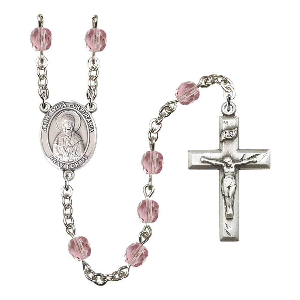 Silver Finish Rosary features 6mm light purple Czech Fire Polished glass beads. The centerpiece features a St. Lydia Purpuraria medal. Light Amethyst is the birthstone color for June.