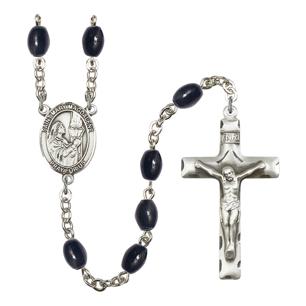 Silver Finish Rosary features 8x6mm Black Onyx beads. The centerpiece features a St. Mary Magdalene medal..