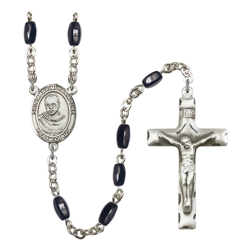 Silver Finish Rosary features 8x5mm Black Onyx beads. The centerpiece features a St. Maximilian Kolbe medal..