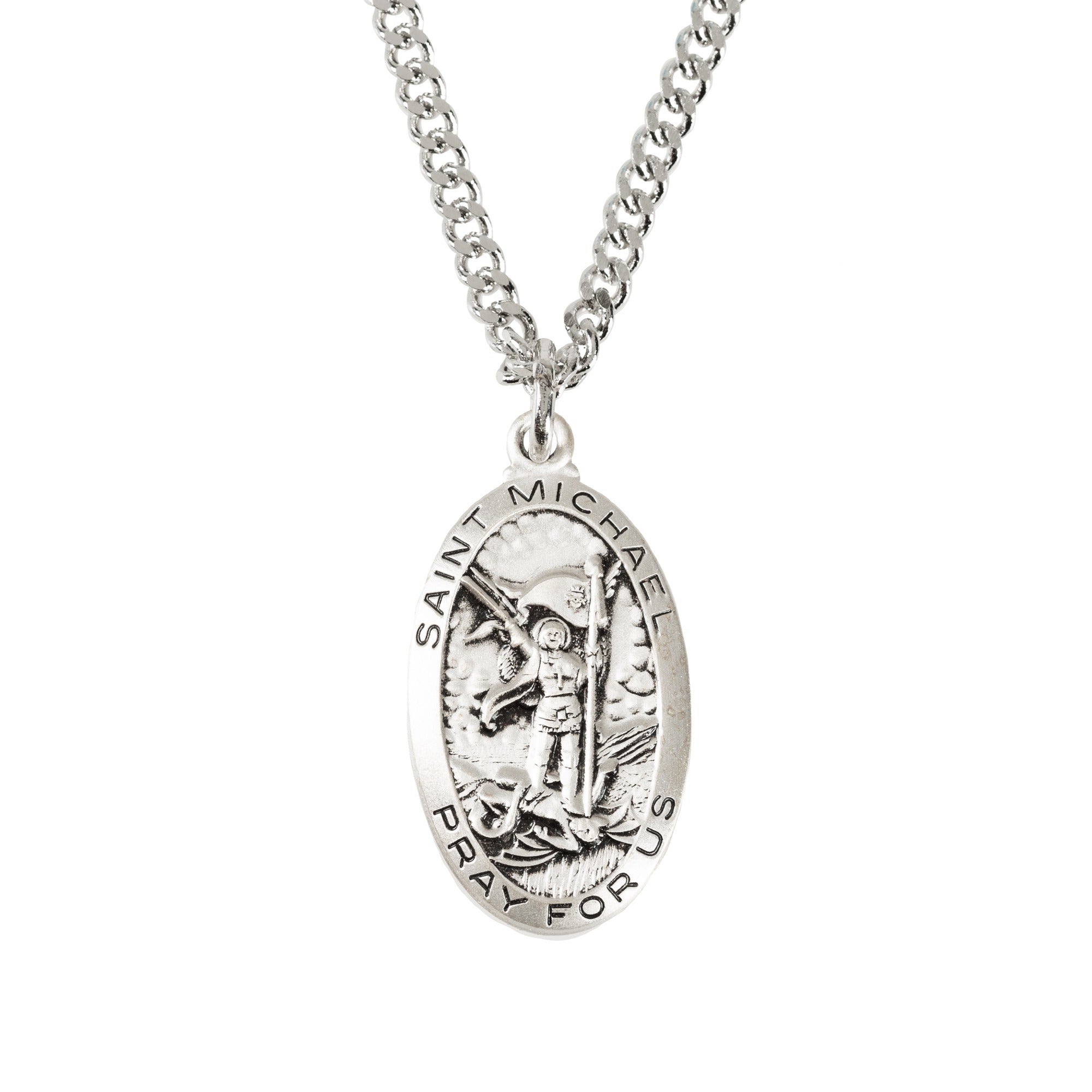 This St. Michael Medal features a sterling silver oval design on a durable 24-inch rhodium-plated chain with a lobster clasp. A classic symbol of devotion to St. Michael, the heavenly defender and leader of God's angelic army, it makes an ideal gift. The medal is 1 inch and comes elegantly gift boxed.