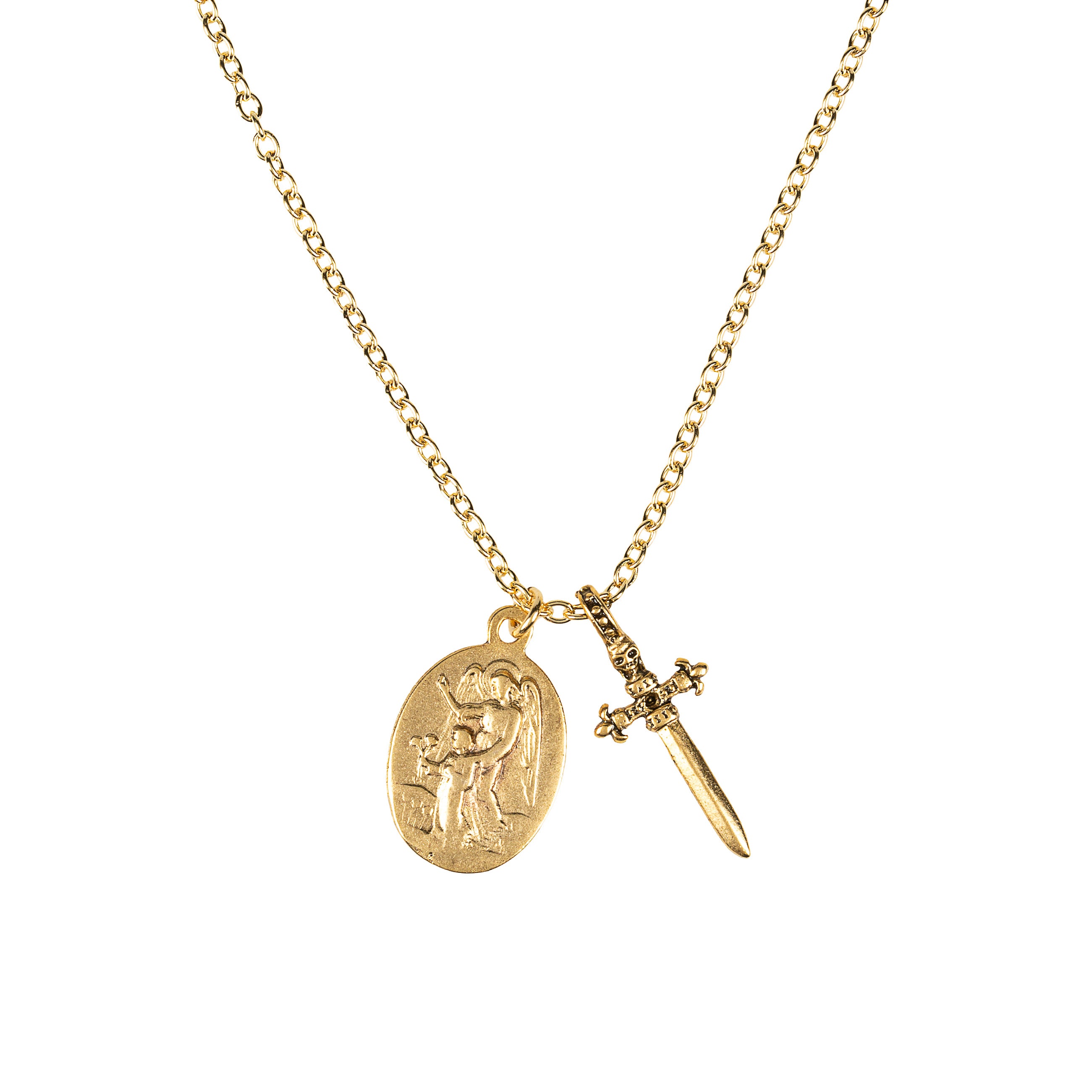 This handcrafted St. Michael Medal & Sword Cross Necklace features a vintage St. Michael medal with a Guardian Angel on the reverse, paired with a miniature sword Cross. Designed on an antique gold box chain, it embodies timeless faith and protection. A striking gift for someone special or a cherished addition to your collection, it symbolizes God's love and presence.