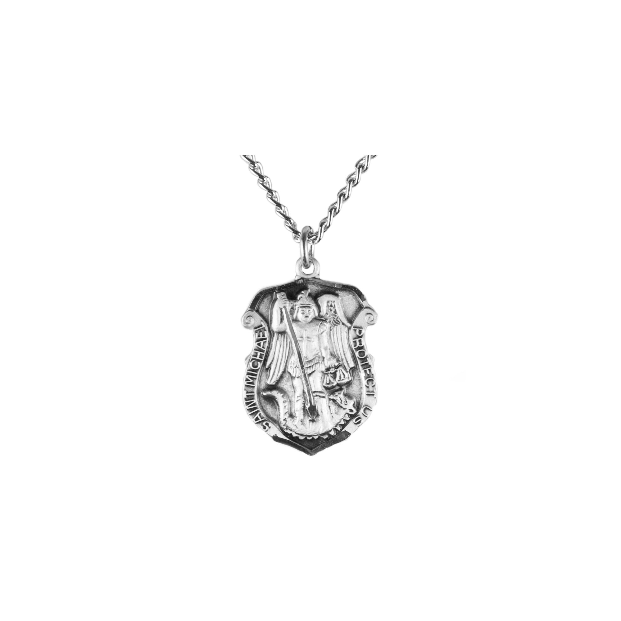The St. Michael Shield Medal offers a unique sterling silver design symbolizing protection, making it ideal for members of the armed forces and public safety. The medal features the inscription "Saint Michael Protect Us" and comes with a durable, easy-to-wear 24" rhodium-plated chain. This striking piece reflects St. Michael's role as a heavenly protector, ready to shield those in need.