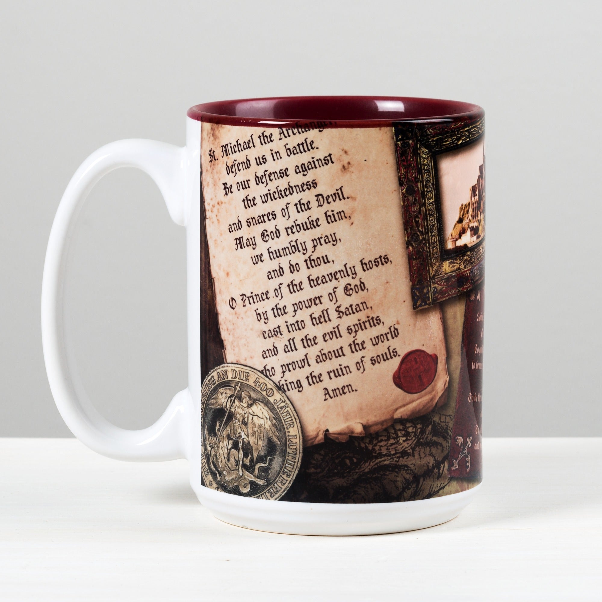 The ever-powerful archangel, St. Michael, comes to life in this artfully designed story mug. Engaging imagery and a prayer make this a unique way to enjoy your daily coffee or tea. From the Old Testament times until today, St. Michael the Archangel has always powerfully defended and assisted God's people on earth. Based on scripture, Church history and saintly traditions, this saint story mug artfully depicts St. Michael's role as Guardian Angel of the Catholic Church, as defender of souls, and heaven's supreme defender. A treasury of images arranged in a scrapbook style, this St. Michael the Archangel coffee mug will remind you to call upon the Heavenly Defender in your daily spiritual battles!