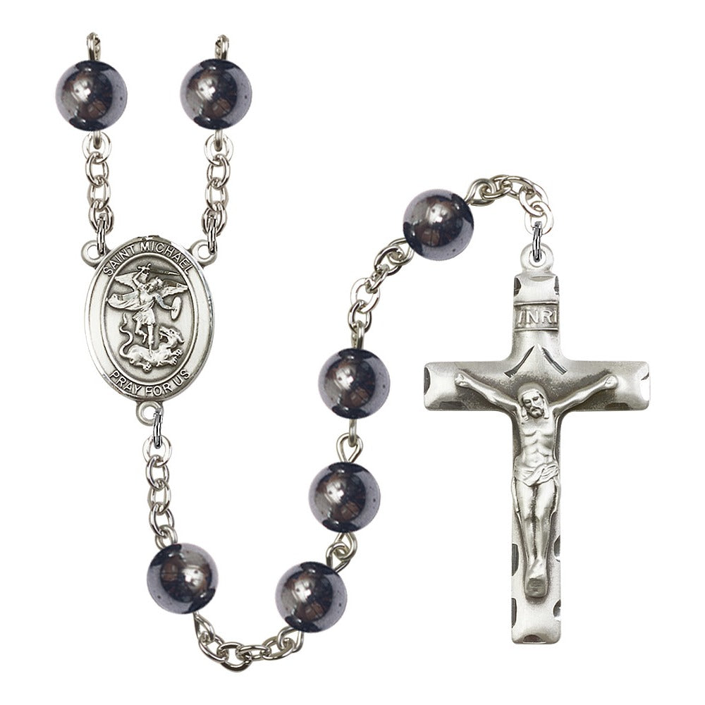 Silver Finish Rosary features 8mm Hematite beads. The centerpiece features a St. Michael the Archangel medal..