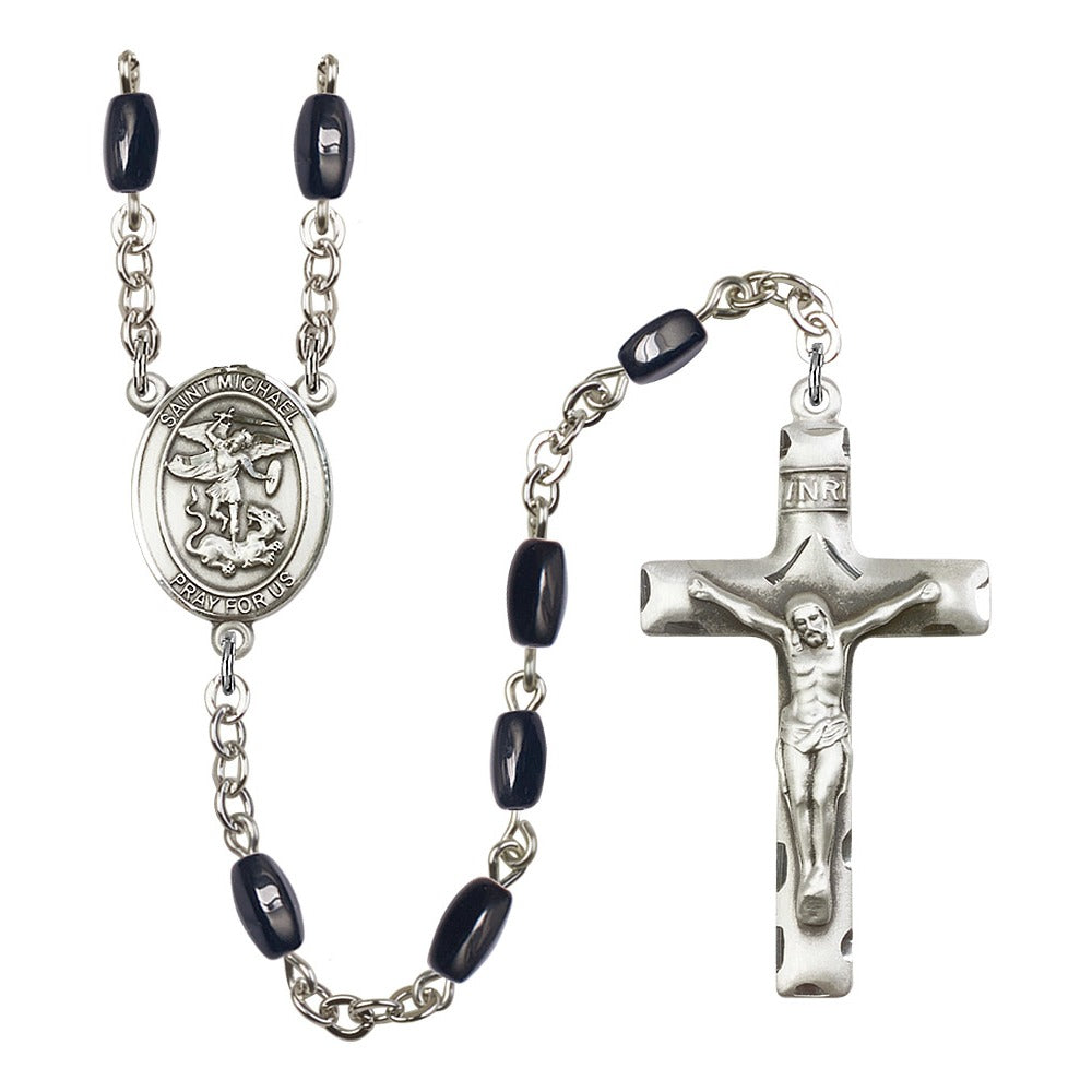 Silver Finish Rosary features 8x5mm Black Onyx beads. The centerpiece features a St. Michael the Archangel medal..