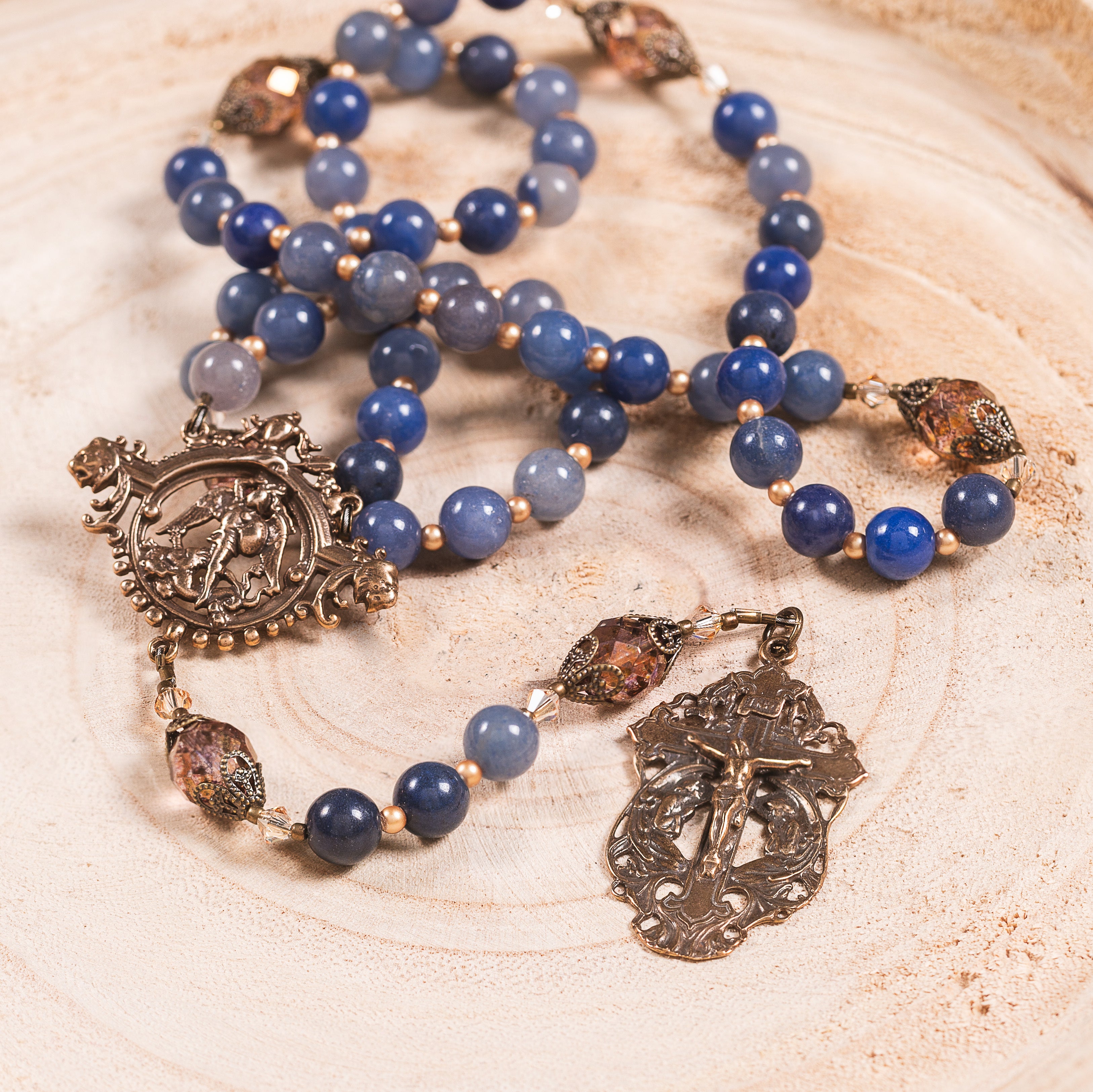 Our Father beads are Czech fire-polished crystal, aflame with golden-orange luster that reminds us of the heat of battle. Flanked by elegant filigree caps, they reflect light exquisitely onto gorgeous, Blue Aventurine Hail Mary beads, smooth in texture and movement, and reminiscent of the heavens. These rich & varied tones of blue symbolize the distance between the world we must inhabit and eternity, where Our Lord & Our Lady await our glorious arrival.