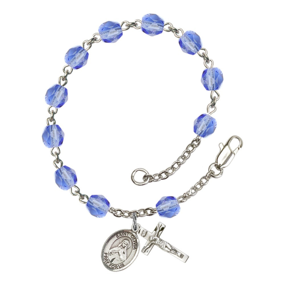 Silver Finish Rosary Bracelet features 6mm blue Czech Fire Polished glass beads. The Crucifix measures 5/8 x 1/4. The charm features a St. Olivia medal. Lead free bright pewter crucifix and center. Rhodium plated wire guaranteed to not tarnish. Sapphire is the birthstone color for September. Made in the USA.