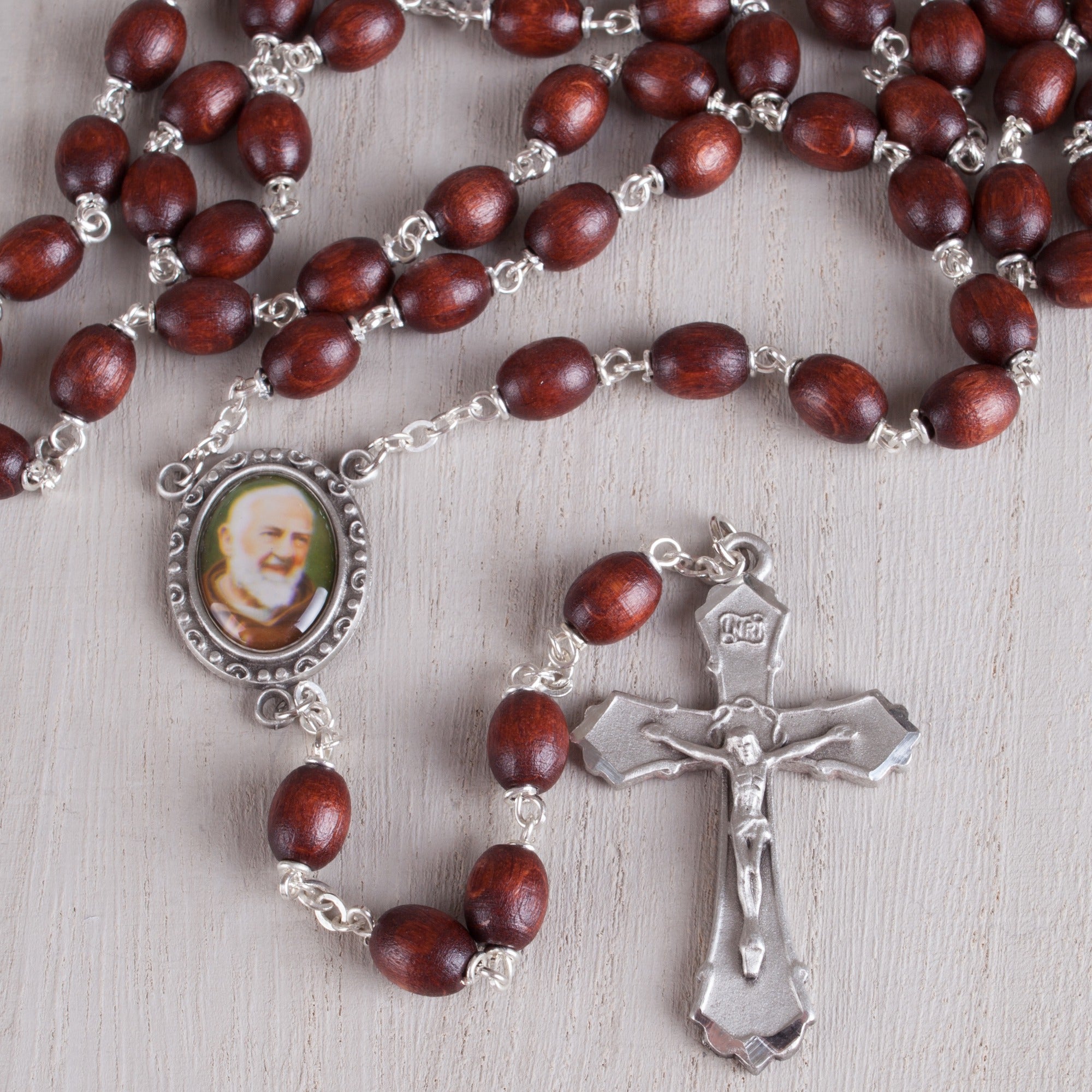 A distinguished rosary with masculine flare, featuring cherry-colored wooden beads in generous, oblong size, accented by a silver tone chain and Crucifix. The centerpiece is a full-color image of St. Padre Pio. The handsome Crucifix features a Crown of Thorns at the center. Padre Pio, the miracle worker who was a Franciscan priest, mystic, and stigmatist, is the Patron Saint of Civil Defense Workers, Adolescents, Stress Relief, Hospital Patients, and Pietrelcina, Italy, his native city.