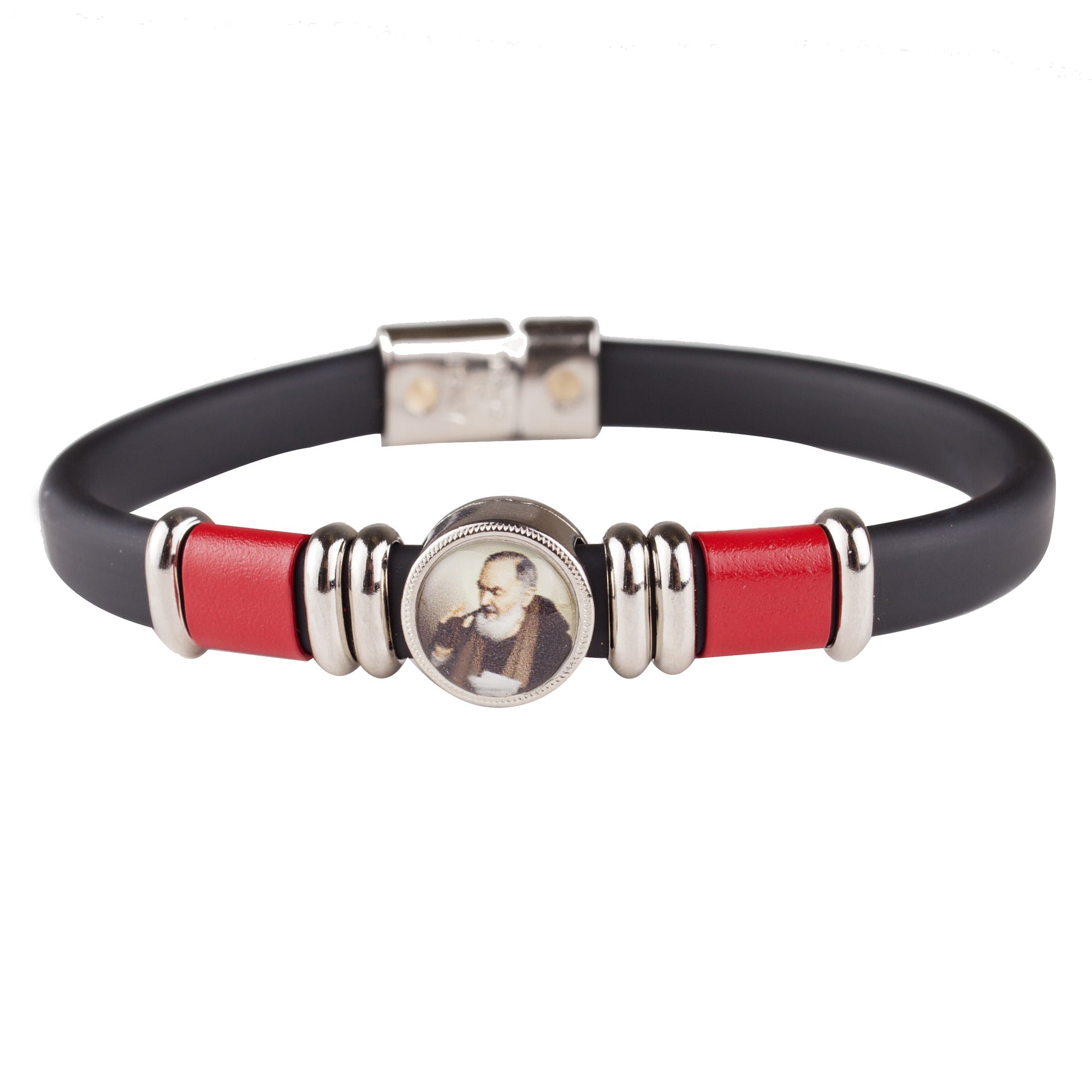 A simple statement of faith, this wristlet features the popular saint, Saint Padre Pio, centered on a durable black band. Red and silver accent pieces adorn the flexible band. Perfect for Confirmation groups, RCIA groups, and Faith Formation classes. Ideal for teen gift giving. Attractive, contemporary design.