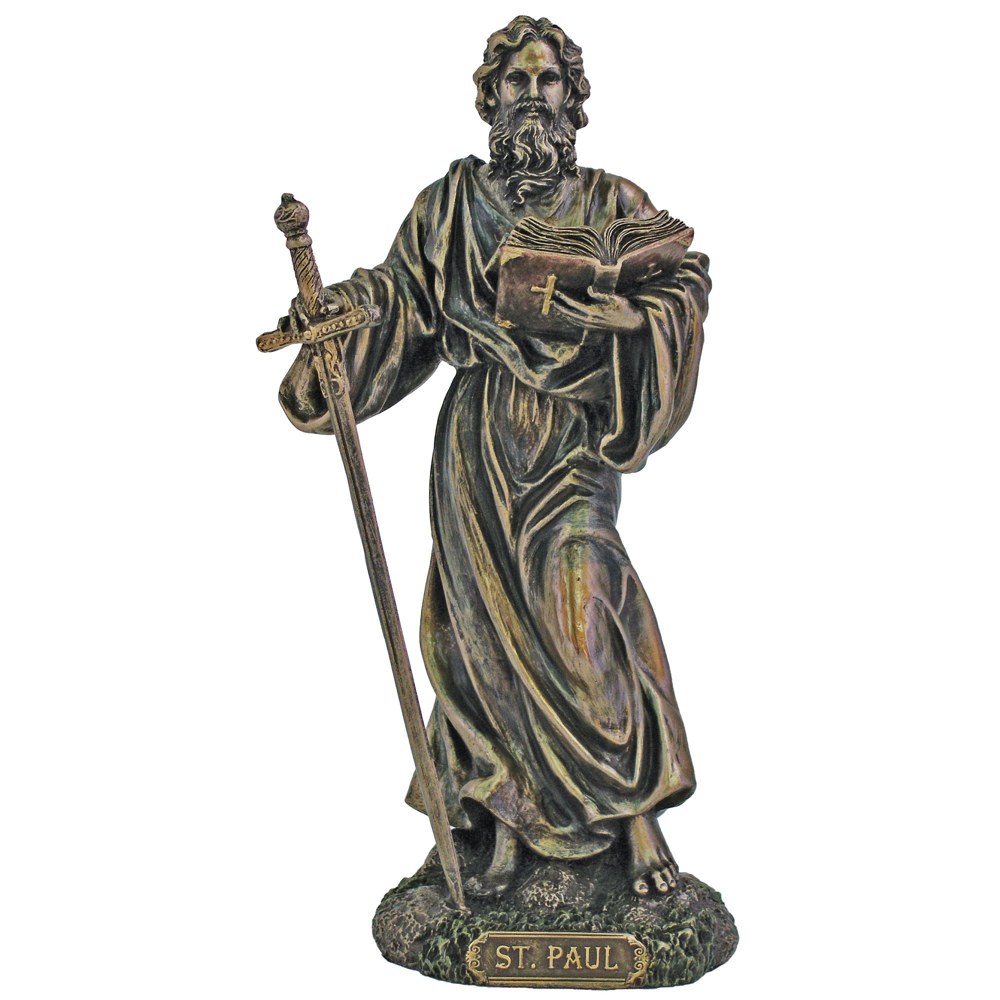 The St. Paul Statue is made of resin, then expertly hand-painted for a strong and elegant antiqued look. From the Veronese Collection. Dimensions: 4'' (W) x 1.5'' (D) x 8'' (H)