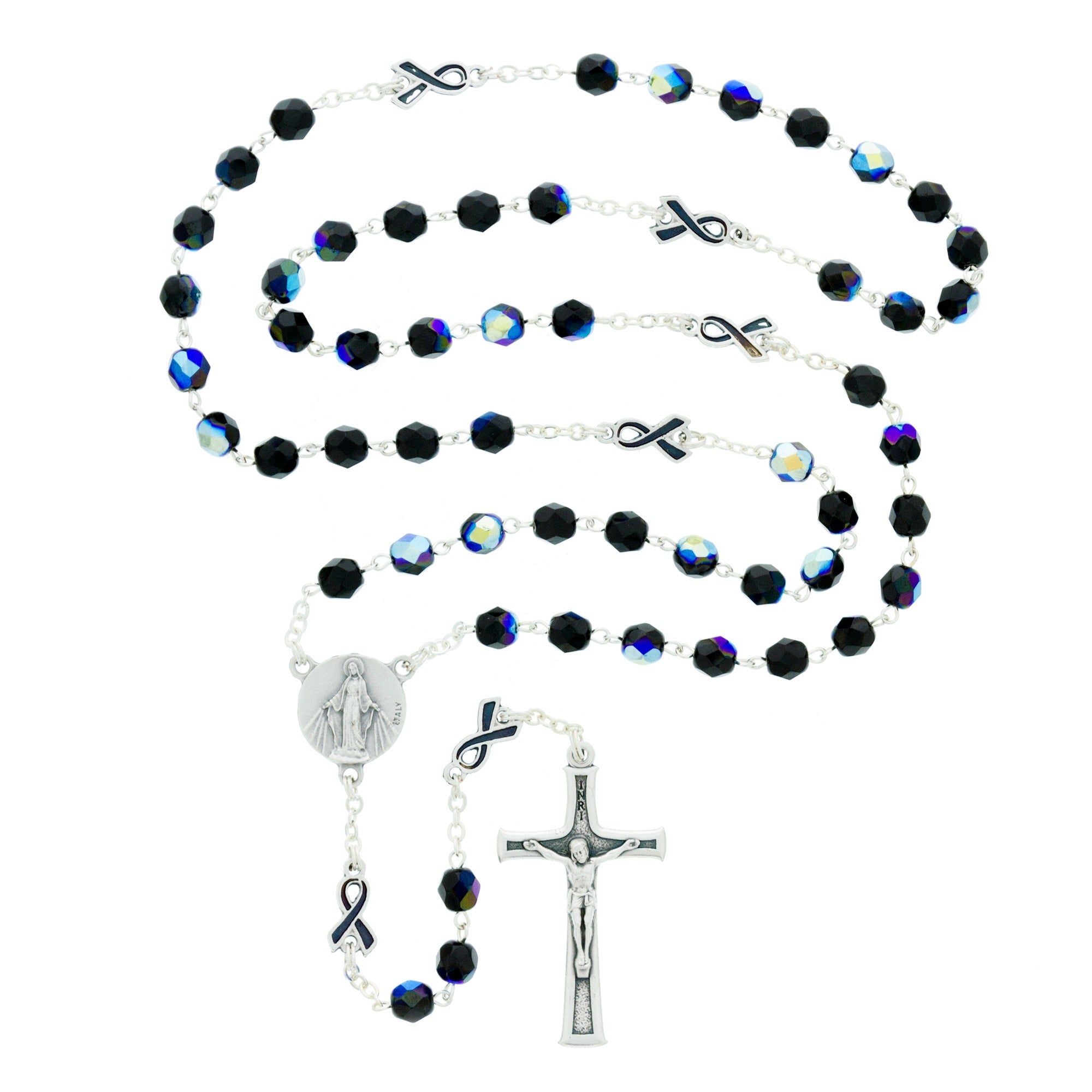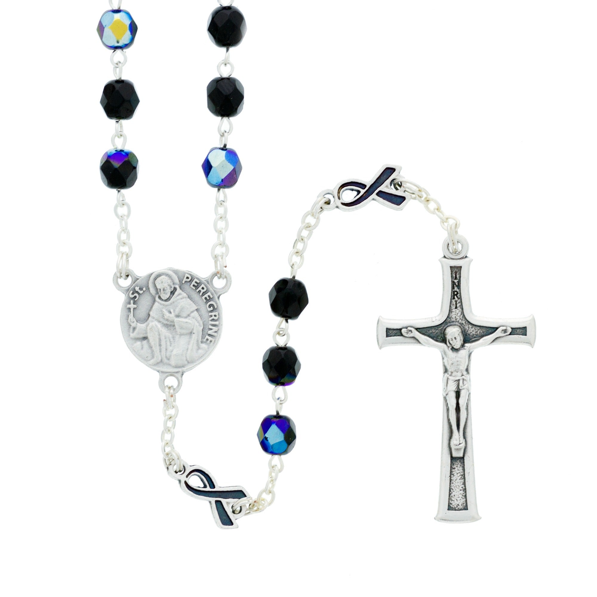 This beautiful St. Peregrine Rosary is a heartfelt devotional tool, made with mesmerizing Aurora Borealis faceted beads. Featuring cancer ribbons as the Our Father beads, it's perfect for praying for those afflicted by cancer. Made in Italy, this rosary invites the intercession of St. Peregrine, the patron saint of cancer sufferers. St. Peregrine, pray for us!