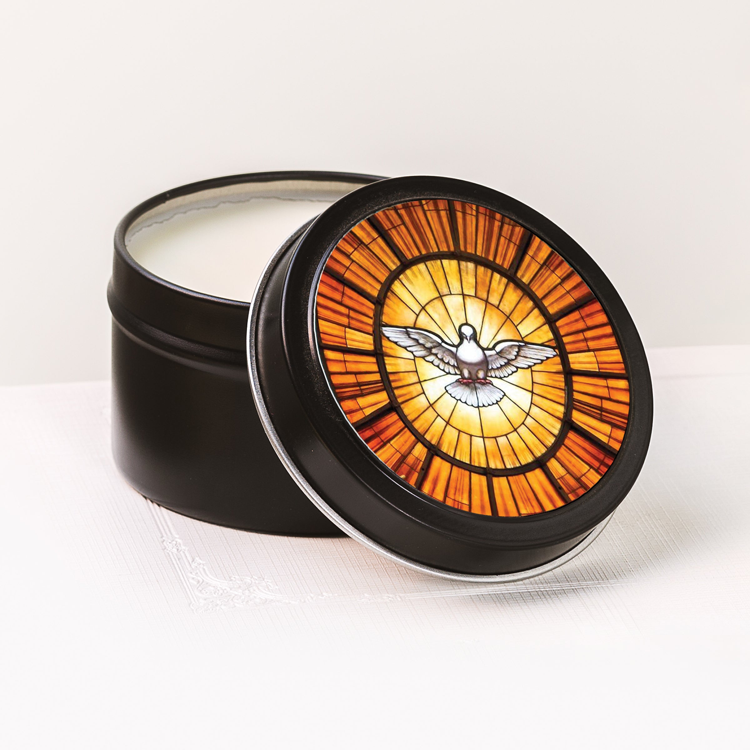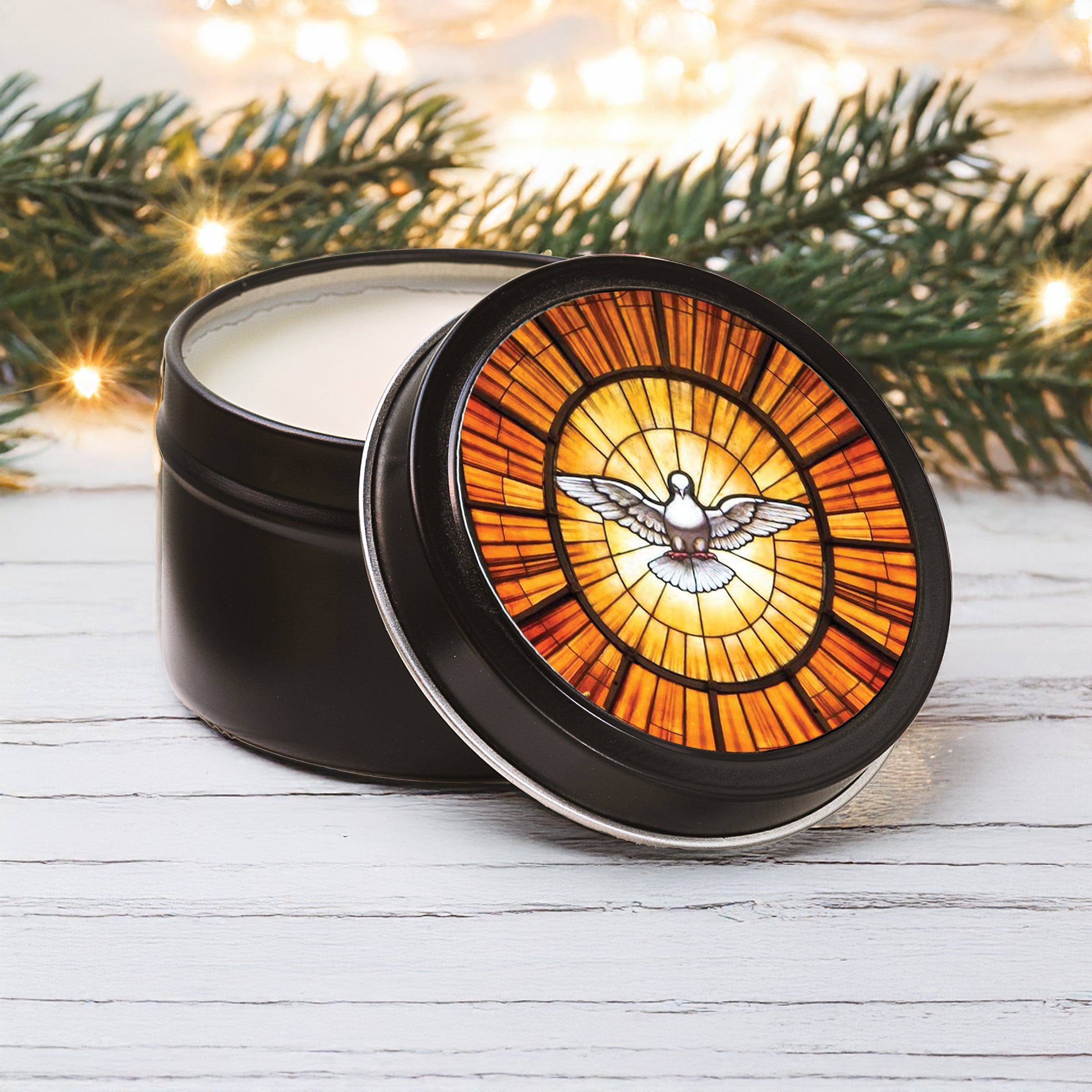 The St. Peter's Basilica Dove Candle Tin offers an invigorating Christmas Tree scent with balsam and pine notes, evoking holiday joy and winter comfort. Encased in a matte black tin, it features artwork of the Holy Spirit window. Perfect for prayer or relaxation, it's a thoughtful gift for travelers or loved ones, providing peace wherever it's enjoyed. Exclusively designed by The Catholic Company.