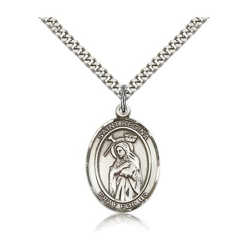The St. Regina Pendant with Chain features a beautifully crafted Sterling Silver medal honoring St. Regina, patron against poverty. Measuring 1 x 3/4 inches, it hangs on a durable 24'' Light Rhodium Heavy Curb Chain with a clasp. Hand-made in the USA and guaranteed not to tarnish, this elegant piece marries spiritual devotion with quality craftsmanship.