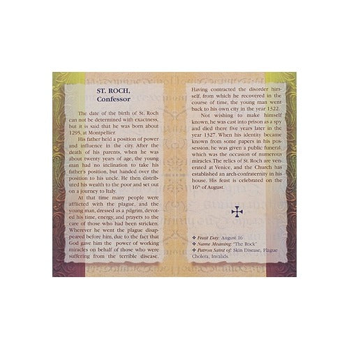 This beautiful St. Roch folded, glossy prayer card features gold stamped Italian art on the front cover, a 2 page biography, along with the meaning of his name and his feast day printed on the inside, and a popular prayer of intercession on the back cover. This "Mini Lives of the Saints" prayer card offers readers an artistically crafted, informative reference into the life of St. Roch.