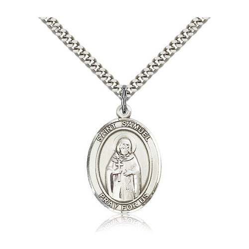 Sterling Silver St. Samuel Pendant on a 24" Light Rhodium Heavy Curb Chain with clasp. Size: 1 x 3/4. Made in the USA.