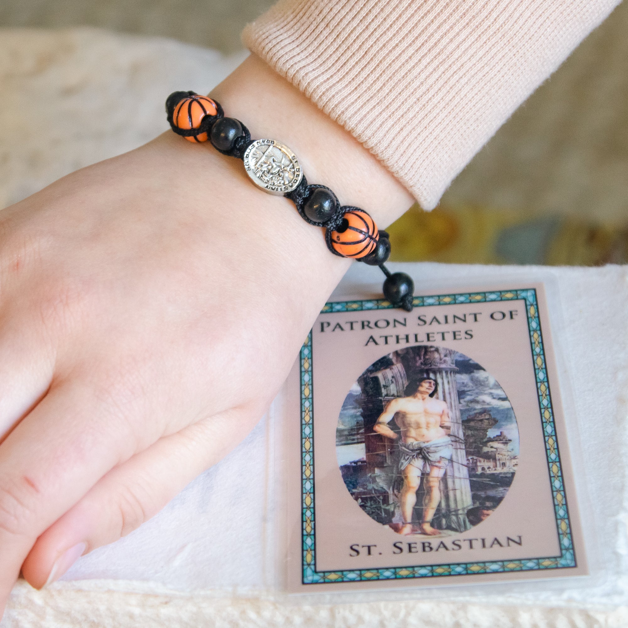 Celebrate your faith and passion for basketball with this St. Sebastian Corded Basketball Bracelet. Featuring black cording, wood beads, and a St. Sebastian medal, this bracelet includes basketball-shaped beads for enthusiasts. It’s the perfect faith-inspired gift for athletes, featuring an adjustable fit and accompanied by a St. Sebastian prayer card, making it a meaningful accessory for any player.