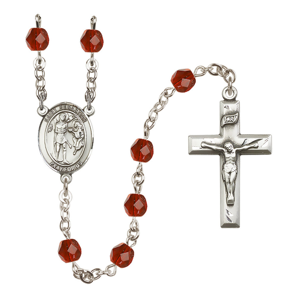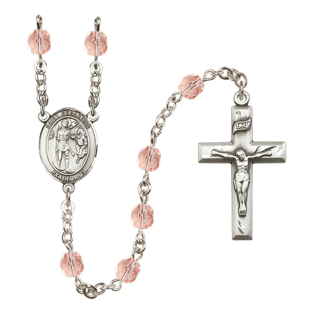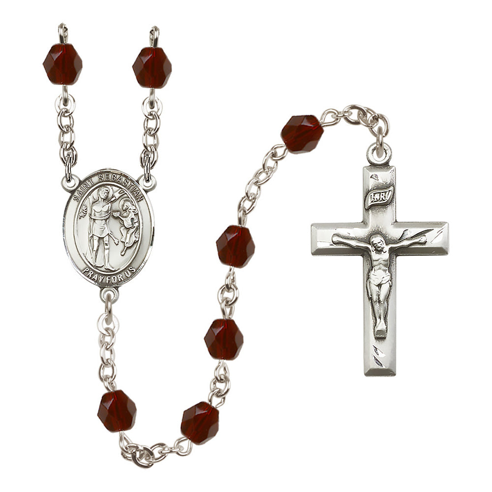 This St. Sebastian Crystal Birthstone Rosary is a personalized, elegant gift, featuring hand-made craftsmanship in the USA. Choose from various birthstone colors for the 6mm Fire Polished glass beads. A lead-free pewter crucifix and centerpiece depict St. Sebastian, the patron of athletes and soldiers, all set on a tarnish-resistant rhodium plated wire. Perfect for honoring faith and personal touch.