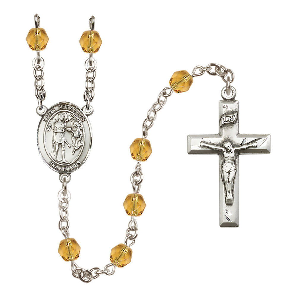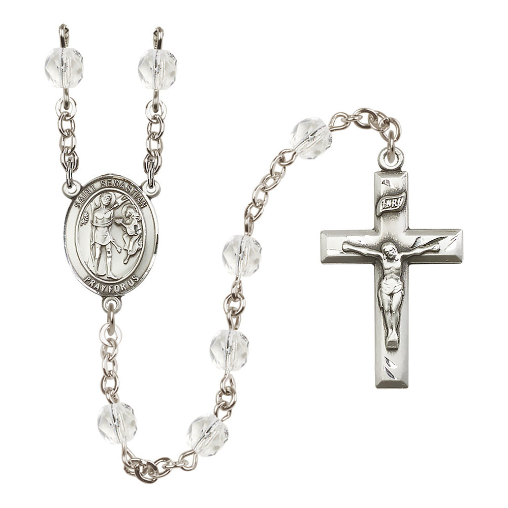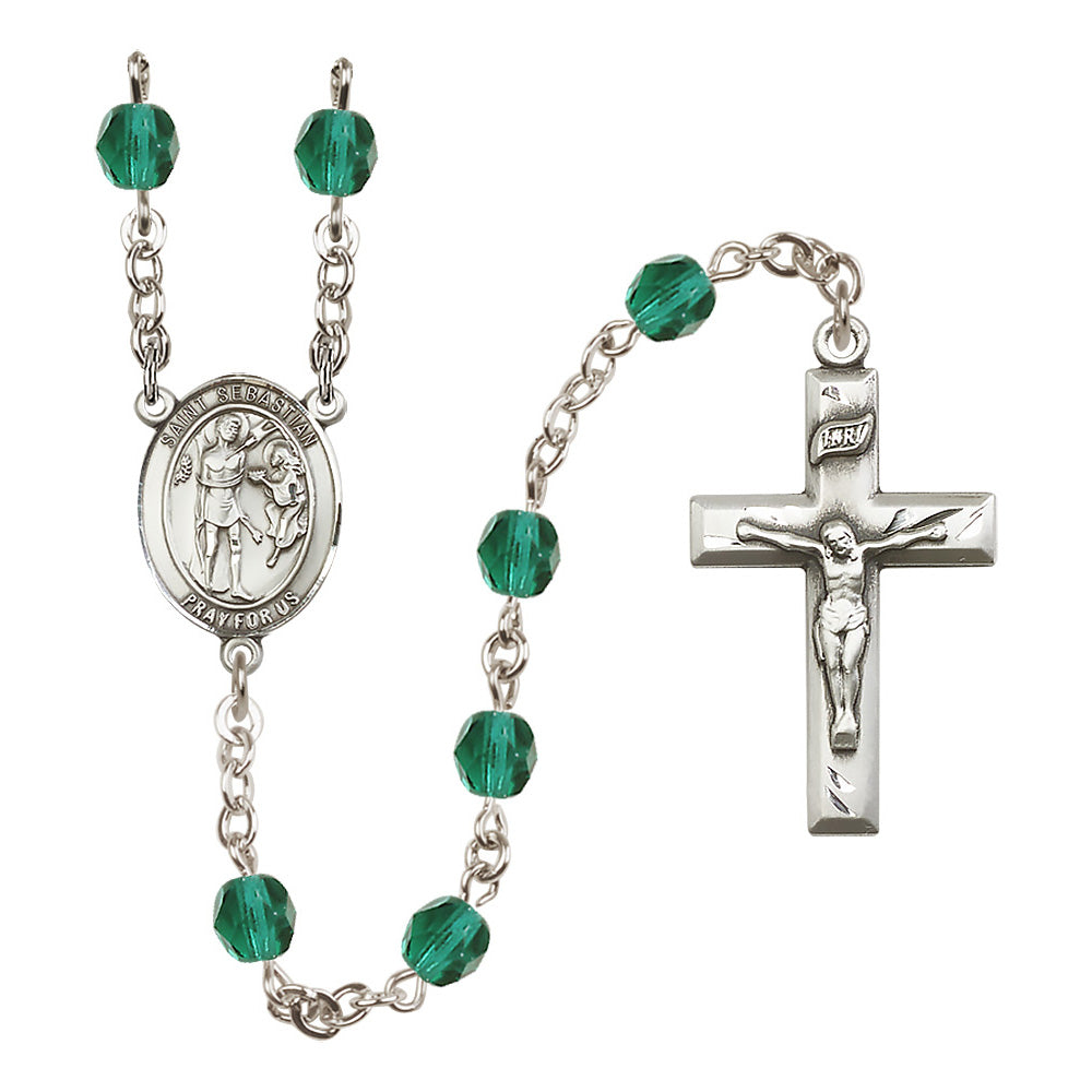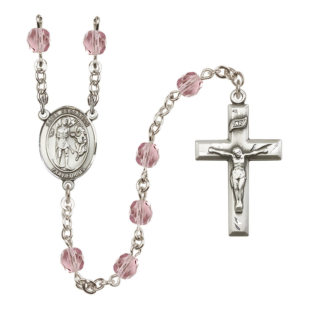 This St. Sebastian Crystal Birthstone Rosary is a personalized, elegant gift, featuring hand-made craftsmanship in the USA. Choose from various birthstone colors for the 6mm Fire Polished glass beads. A lead-free pewter crucifix and centerpiece depict St. Sebastian, the patron of athletes and soldiers, all set on a tarnish-resistant rhodium plated wire. Perfect for honoring faith and personal touch.