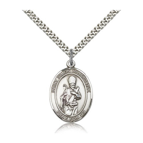 Sterling Silver St. Simon Pendant on a Light Rhodium Heavy Curb 24" Chain with clasp. Size: 1 x 3/4. Made in the USA.